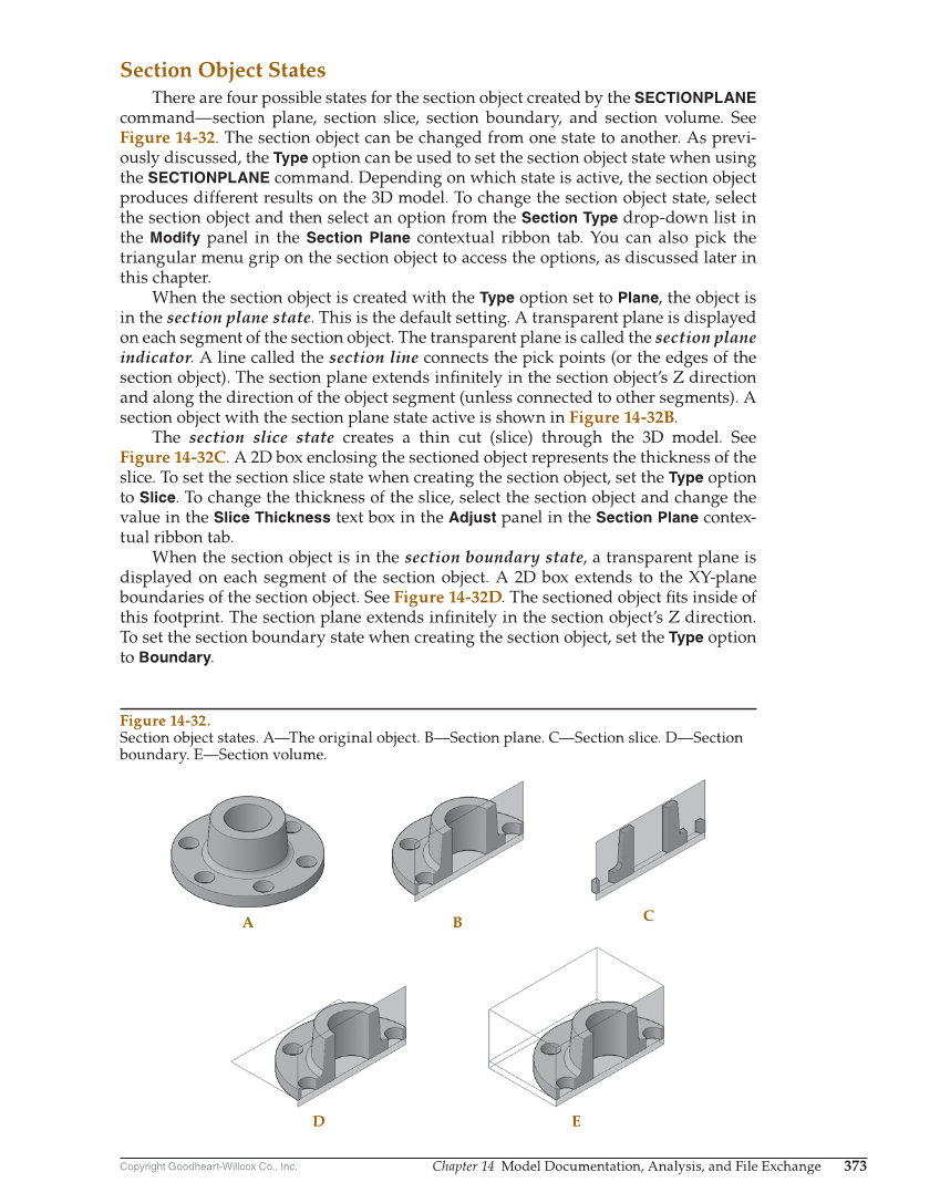Copyright Goodheart-Willcox Co., Inc. Chapter 14 Model Documentation, Analysis, and File Exchange 373 Section Object States There are four possible states for the section object created by the SECTIONPLANE command—section plane, section slice, section boundary, and section volume. See Figure 14-32. The section object can be changed from one state to another. As previ- ously discussed, the Type option can be used to set the section object state when using the SECTIONPLANE command. Depending on which state is active, the section object produces different results on the 3D model. To change the section object state, select the section object and then select an option from the Section Type drop-down list in the Modify panel in the Section Plane contextual ribbon tab. You can also pick the triangular menu grip on the section object to access the options, as discussed later in this chapter. When the section object is created with the Type option set to Plane, the object is in the section plane state. This is the default setting. A transparent plane is displayed on each segment of the section object. The transparent plane is called the section plane indicator. A line called the section line connects the pick points (or the edges of the section object). The section plane extends infi nitely in the section object’s Z direction and along the direction of the object segment (unless connected to other segments). A section object with the section plane state active is shown in Figure 14-32B. The section slice state creates a thin cut (slice) through the 3D model. See Figure 14-32C. A 2D box enclosing the sectioned object represents the thickness of the slice. To set the section slice state when creating the section object, set the Type option to Slice. To change the thickness of the slice, select the section object and change the value in the Slice Thickness text box in the Adjust panel in the Section Plane contex- tual ribbon tab. When the section object is in the section boundary state, a transparent plane is displayed on each segment of the section object. A 2D box extends to the XY-plane boundaries of the section object. See Figure 14-32D. The sectioned object fi ts inside of this footprint. The section plane extends infi nitely in the section object’s Z direction. To set the section boundary state when creating the section object, set the Type option to Boundary. A B D E C Figure 14-32. Section object states. A—The original object. B—Section plane. C—Section slice. D—Section boundary. E—Section volume.