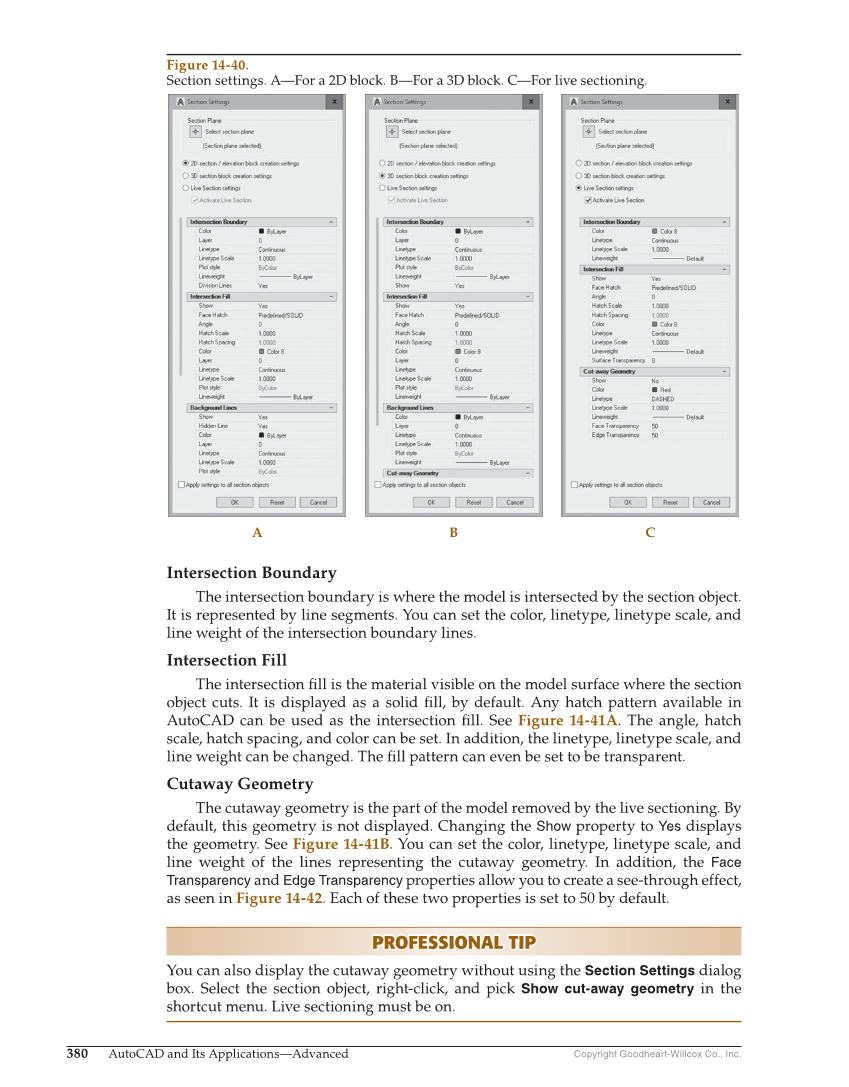 Copyright Goodheart-Willcox Co., Inc. 380 AutoCAD and Its Applications—Advanced Intersection Boundary The intersection boundary is where the model is intersected by the section object. It is represented by line segments. You can set the color, linetype, linetype scale, and line weight of the intersection boundary lines. Intersection Fill The intersection fi ll is the material visible on the model surface where the section object cuts. It is displayed as a solid fi ll, by default. Any hatch pattern available in AutoCAD can be used as the intersection fi ll. See Figure 14-41A. The angle, hatch scale, hatch spacing, and color can be set. In addition, the linetype, linetype scale, and line weight can be changed. The fi ll pattern can even be set to be transparent. Cutaway Geometry The cutaway geometry is the part of the model removed by the live sectioning. By default, this geometry is not displayed. Changing the Show property to Yes displays the geometry. See Figure 14-41B. You can set the color, linetype, linetype scale, and line weight of the lines representing the cutaway geometry. In addition, the Face Transparency and Edge Transparency properties allow you to create a see-through effect, as seen in Figure 14-42. Each of these two properties is set to 50 by default. PROFESSIONAL TIP PROFESSIONAL TIP You can also display the cutaway geometry without using the Section Settings dialog box. Select the section object, right-click, and pick Show cut-away geometry in the shortcut menu. Live sectioning must be on. C B A Figure 14-40. Section settings. A—For a 2D block. B—For a 3D block. C—For live sectioning.
