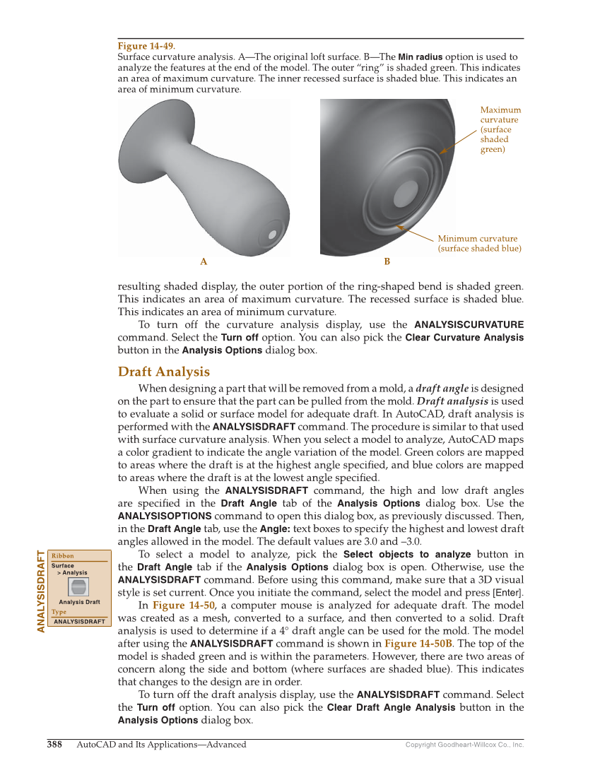 Copyright Goodheart-Willcox Co., Inc. 388 AutoCAD and Its Applications—Advanced resulting shaded display, the outer portion of the ring-shaped bend is shaded green. This indicates an area of maximum curvature. The recessed surface is shaded blue. This indicates an area of minimum curvature. To turn off the curvature analysis display, use the ANALYSISCURVATURE command. Select the Turn off option. You can also pick the Clear Curvature Analysis button in the Analysis Options dialog box. Draft Analysis When designing a part that will be removed from a mold, a draft angle is designed on the part to ensure that the part can be pulled from the mold. Draft analysis is used to evaluate a solid or surface model for adequate draft. In AutoCAD, draft analysis is performed with the ANALYSISDRAFT command. The procedure is similar to that used with surface curvature analysis. When you select a model to analyze, AutoCAD maps a color gradient to indicate the angle variation of the model. Green colors are mapped to areas where the draft is at the highest angle specifi ed, and blue colors are mapped to areas where the draft is at the lowest angle specifi ed. When using the ANALYSISDRAFT command, the high and low draft angles are specifi ed in the Draft Angle tab of the Analysis Options dialog box. Use the ANALYSISOPTIONS command to open this dialog box, as previously discussed. Then, in the Draft Angle tab, use the Angle: text boxes to specify the highest and lowest draft angles allowed in the model. The default values are 3.0 and –3.0. To select a model to analyze, pick the Select objects to analyze button in the Draft Angle tab if the Analysis Options dialog box is open. Otherwise, use the ANALYSISDRAFT command. Before using this command, make sure that a 3D visual style is set current. Once you initiate the command, select the model and press [Enter]. In Figure 14-50, a computer mouse is analyzed for adequate draft. The model was created as a mesh, converted to a surface, and then converted to a solid. Draft analysis is used to determine if a 4° draft angle can be used for the mold. The model after using the ANALYSISDRAFT command is shown in Figure 14-50B. The top of the model is shaded green and is within the parameters. However, there are two areas of concern along the side and bottom (where surfaces are shaded blue). This indicates that changes to the design are in order. To turn off the draft analysis display, use the ANALYSISDRAFT command. Select the Turn off option. You can also pick the Clear Draft Angle Analysis button in the Analysis Options dialog box. ANALYSISDRAFT Ribbon Surface Analysis Analysis Draft Type ANALYSISDRAFT A B Minimum curvature (surface shaded blue) Maximum curvature (surface shaded green) Figure 14-49. Surface curvature analysis. A—The original loft surface. B—The Min radius option is used to analyze the features at the end of the model. The outer “ring” is shaded green. This indicates an area of maximum curvature. The inner recessed surface is shaded blue. This indicates an area of minimum curvature.