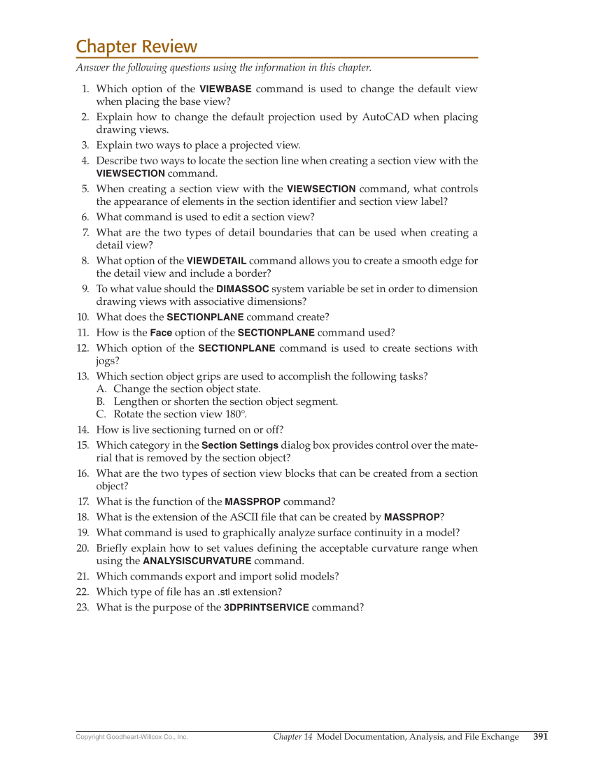 Copyright Goodheart-Willcox Co., Inc. Chapter 14 Model Documentation, Analysis, and File Exchange 391 Chapter Review Answer the following questions using the information in this chapter. 1. Which option of the VIEWBASE command is used to change the default view when placing the base view? 2. Explain how to change the default projection used by AutoCAD when placing drawing views. 3. Explain two ways to place a projected view. 4. Describe two ways to locate the section line when creating a section view with the VIEWSECTION command. 5. When creating a section view with the VIEWSECTION command, what controls the appearance of elements in the section identifier and section view label? 6. What command is used to edit a section view? 7. What are the two types of detail boundaries that can be used when creating a detail view? 8. What option of the VIEWDETAIL command allows you to create a smooth edge for the detail view and include a border? 9. To what value should the DIMASSOC system variable be set in order to dimension drawing views with associative dimensions? 10. What does the SECTIONPLANE command create? 11. How is the Face option of the SECTIONPLANE command used? 12. Which option of the SECTIONPLANE command is used to create sections with jogs? 13. Which section object grips are used to accomplish the following tasks? A. Change the section object state. B. Lengthen or shorten the section object segment. C. Rotate the section view 180°. 14. How is live sectioning turned on or off? 15. Which category in the Section Settings dialog box provides control over the mate- rial that is removed by the section object? 16. What are the two types of section view blocks that can be created from a section object? 17. What is the function of the MASSPROP command? 18. What is the extension of the ASCII file that can be created by MASSPROP? 19. What command is used to graphically analyze sur face continuity in a model? 20. Briefly explain how to set values defining the acceptable curvature range when using the ANALYSISCURVATURE command. 21. Which commands export and import solid models? 22. Which type of file has an .stl extension? 23. What is the purpose of the 3DPRINTSERVICE command?