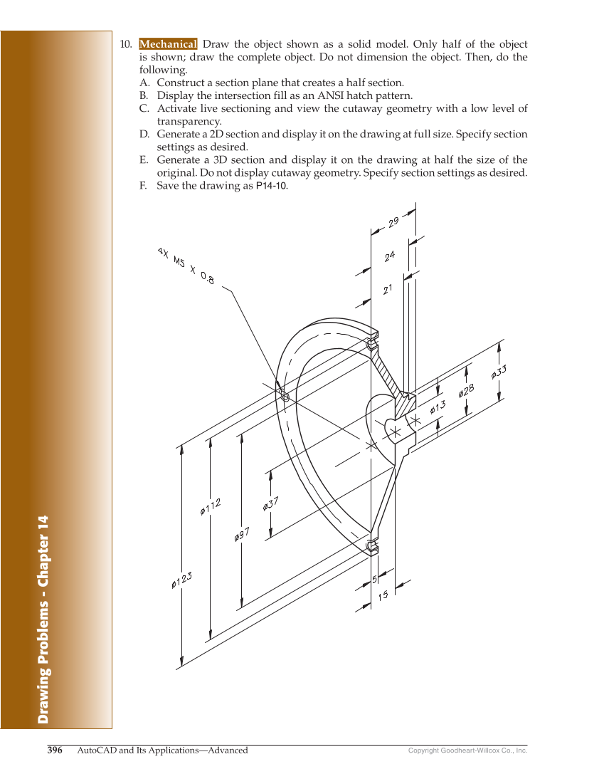 Drawing Problems - Chapter 14 Copyright Goodheart-Willcox Co., Inc. 396 AutoCAD and Its Applications—Advanced 10. Mechanical Draw the object shown as a solid model. Only half of the object is shown draw the complete object. Do not dimension the object. Then, do the following. A. Construct a section plane that creates a half section. B. Display the intersection fill as an ANSI hatch pattern. C. Activate live sectioning and view the cutaway geometry with a low level of transparency. D. Generate a 2D section and display it on the drawing at full size. Specify section settings as desired. E. Generate a 3D section and display it on the drawing at half the size of the original. Do not display cutaway geometry. Specify section settings as desired. F. Save the drawing as P14-10.