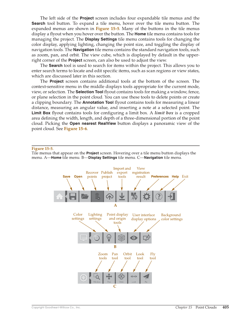 Copyright Goodheart-Willcox Co., Inc. Chapter 15 Point Clouds 405 The left side of the Project screen includes four expandable tile menus and the Search tool button. To expand a tile menu, hover over the tile menu button. The expanded menus are shown in Figure 15-5. Many of the buttons in the tile menus display a fl yout when you hover over the button. The Home tile menu contains tools for managing the project. The Display Settings tile menu contains tools for changing the color display, applying lighting, changing the point size, and toggling the display of navigation tools. The Navigation tile menu contains the standard navigation tools, such as zoom, pan, and orbit. The view cube, which is displayed by default in the upper- right corner of the Project screen, can also be used to adjust the view. The Search tool is used to search for items within the project. This allows you to enter search terms to locate and edit specifi c items, such as scan regions or view states, which are discussed later in this section. The Project screen contains additional tools at the bottom of the screen. The context-sensitive menu in the middle displays tools appropriate for the current mode, view, or selection. The Selection Tool fl yout contains tools for making a window, fence, or plane selection in the point cloud. You can use these tools to delete points or create a clipping boundary. The Annotation Tool fl yout contains tools for measuring a linear distance, measuring an angular value, and inserting a note at a selected point. The Limit Box fl yout contains tools for confi guring a limit box. A limit box is a cropped area defi ning the width, length, and depth of a three-dimensional portion of the point cloud. Picking the Open nearest RealView button displays a panoramic view of the point cloud. See Figure 15-6. Save A B C Open Preferences Help Recover points Publish project Import and export tools View registration result Exit Lighting settings Color settings Point display and origin tools User interface display options Pan tool Orbit tool Look tool Fly tool Zoom tools Background color settings Figure 15-5. Tile menus that appear on the Project screen. Hovering over a tile menu button displays the menu. A—Home tile menu. B—Display Settings tile menu. C—Navigation tile menu.