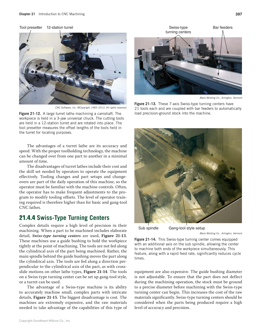 Chapter 21 Introduction to CNC Machining 397 Copyright Goodheart-Willcox Co., Inc. The advantages of a turret lathe are its accuracy and speed. With the proper toolholding technology, the machine can be changed over from one part to another in a minimal amount of time. The disadvantages of turret lathes include their cost and the skill set needed by operators to operate the equipment effectively. Tooling changes and part setups and change- overs are part of the daily operation of this machine, so the operator must be familiar with the machine controls. Often, the operator has to make frequent adjustments to the pro- gram to modify tooling offsets. The level of operator train- ing required is therefore higher than for basic and gang-tool CNC lathes. 21.4.4 Swiss-Type Turning Centers Complex details require a high level of precision in their machining. When a part to be machined includes elaborate detail, Swiss-type turning centers are used, Figure 21-13. These machines use a guide bushing to hold the workpiece tightly at the point of machining. The tools are not fed along the cylindrical axis of the part being machined. Rather, the main spindle behind the guide bushing moves the part along the cylindrical axis. The tools are fed along a direction per- pendicular to the cylindrical axis of the part, as with cross- slide motions on other lathe types, Figure 21-14. The tools on a Swiss-type turning center can be set up gang-tool style, or a turret can be used. The advantage of a Swiss-type machine is its ability to accurately machine small, complex parts with intricate details, Figure 21-15. The biggest disadvantage is cost. The machines are extremely expensive, and the raw materials needed to take advantage of the capabilities of this type of equipment are also expensive. The guide bushing diameter is not adjustable. To ensure that the part does not deflect during the machining operation, the stock must be ground to a precise diameter before machining with the Swiss-type turning center can begin. This increases the cost of the raw materials significantly. Swiss-type turning centers should be considered when the parts being produced require a high level of accuracy and precision. Tool presetter 12-station turret CNC Software, Inc. ©Copyright 1983–2013. All rights reserved. Figure 21-12. A large turret lathe machining a camshaft. The workpiece is held in a 3-jaw universal chuck. The cutting tools are held in a 12-station turret and are rotated into place. The tool presetter measures the offset lengths of the tools held in the turret for locating purposes. Swiss-type turning centers Bar feeders Sub spindle Gang-tool style setup Mack Molding Co., Arlington, Vermont Figure 21-13. These 7-axis Swiss-type turning centers have 21 tools each and are coupled with bar feeders to automatically load precision-ground stock into the machine. Mack Molding Co., Arlington, Vermont Figure 21-14. This Swiss-type turning center comes equipped with an additional axis on the sub spindle, allowing the center to machine both ends of the workpiece simultaneously. This feature, along with a rapid feed rate, signifi cantly reduces cycle times.