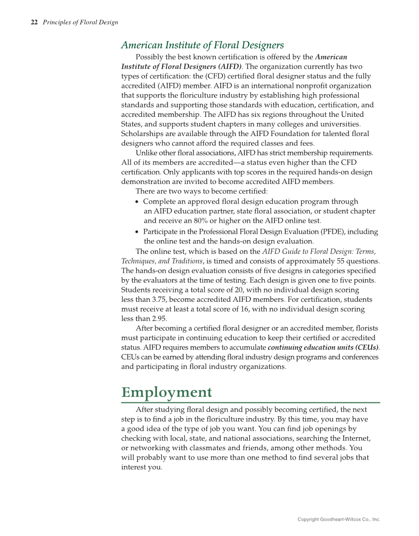 22 Principles of Floral Design American Institute of Floral Designers Possibly the best known certifi cation is offered by the American Institute of Floral Designers (AIFD). The organization currently has two types of certifi cation: the (CFD) certifi ed fl oral designer status and the fully accredited (AIFD) member. AIFD is an international nonprofi t organization that supports the fl oriculture industry by establishing high professional standards and supporting those standards with education, certifi cation, and accredited membership. The AIFD has six regions throughout the United States, and supports student chapters in many colleges and universities. Scholarships are available through the AIFD Foundation for talented fl oral designers who cannot afford the required classes and fees. Unlike other fl oral associations, AIFD has strict membership requirements. All of its members are accredited—a status even higher than the CFD certifi cation. Only applicants with top scores in the required hands-on design demonstration are invited to become accredited AIFD members. There are two ways to become certifi ed: • Complete an approved fl oral design education program through an AIFD education partner, state fl oral association, or student chapter and receive an 80% or higher on the AIFD online test. • Participate in the Professional Floral Design Evaluation (PFDE), including the online test and the hands-on design evaluation. The online test, which is based on the AIFD Guide to Floral Design: Terms, Techniques, and Traditions, is timed and consists of approximately 55 questions. The hands-on design evaluation consists of fi ve designs in categories specifi ed by the evaluators at the time of testing. Each design is given one to fi ve points. Students receiving a total score of 20, with no individual design scoring less than 3.75, become accredited AIFD members. For certifi cation, students must receive at least a total score of 16, with no individual design scoring less than 2.95. After becoming a certifi ed fl oral designer or an accredited member, fl orists must participate in continuing education to keep their certifi ed or accredited status. AIFD requires members to accumulate continuing education units (CEUs). CEUs can be earned by attending fl oral industry design programs and conferences and participating in fl oral industry organizations. Employment After studying fl oral design and possibly becoming certifi ed, the next step is to fi nd a job in the fl oriculture industry. By this time, you may have a good idea of the type of job you want. You can fi nd job openings by checking with local, state, and national associations, searching the Internet, or networking with classmates and friends, among other methods. You will probably want to use more than one method to fi nd several jobs that interest you. Copyright Goodheart-Willcox Co., Inc.