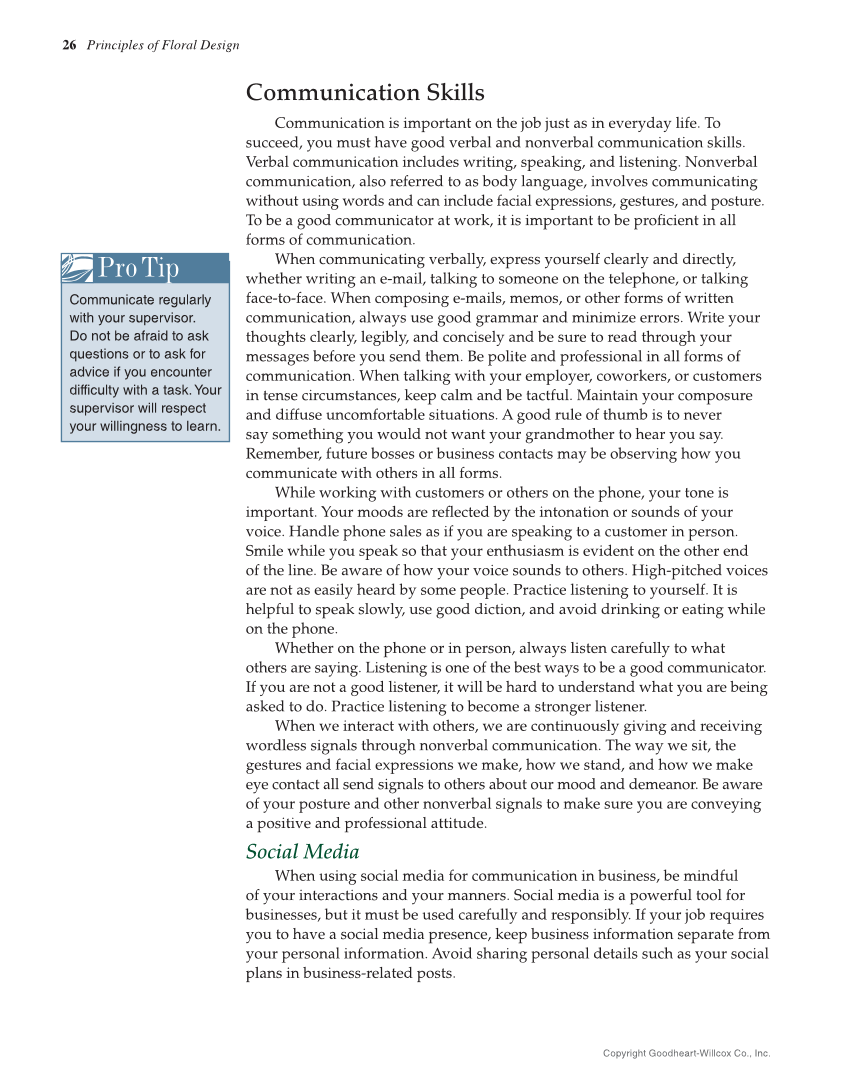 26 Principles of Floral Design Communication Skills Communication is important on the job just as in everyday life. To succeed, you must have good verbal and nonverbal communication skills. Verbal communication includes writing, speaking, and listening. Nonverbal communication, also referred to as body language, involves communicating without using words and can include facial expressions, gestures, and posture. To be a good communicator at work, it is important to be profi cient in all forms of communication. When communicating verbally, express yourself clearly and directly, whether writing an e-mail, talking to someone on the telephone, or talking face-to-face. When composing e-mails, memos, or other forms of written communication, always use good grammar and minimize errors. Write your thoughts clearly, legibly, and concisely and be sure to read through your messages before you send them. Be polite and professional in all forms of communication. When talking with your employer, coworkers, or customers in tense circumstances, keep calm and be tactful. Maintain your composure and diffuse uncomfortable situations. A good rule of thumb is to never say something you would not want your grandmother to hear you say. Remember, future bosses or business contacts may be observing how you communicate with others in all forms. While working with customers or others on the phone, your tone is important. Your moods are refl ected by the intonation or sounds of your voice. Handle phone sales as if you are speaking to a customer in person. Smile while you speak so that your enthusiasm is evident on the other end of the line. Be aware of how your voice sounds to others. High-pitched voices are not as easily heard by some people. Practice listening to yourself. It is helpful to speak slowly, use good diction, and avoid drinking or eating while on the phone. Whether on the phone or in person, always listen carefully to what others are saying. Listening is one of the best ways to be a good communicator. If you are not a good listener, it will be hard to understand what you are being asked to do. Practice listening to become a stronger listener. When we interact with others, we are continuously giving and receiving wordless signals through nonverbal communication. The way we sit, the gestures and facial expressions we make, how we stand, and how we make eye contact all send signals to others about our mood and demeanor. Be aware of your posture and other nonverbal signals to make sure you are conveying a positive and professional attitude. Social Media When using social media for communication in business, be mindful of your interactions and your manners. Social media is a powerful tool for businesses, but it must be used carefully and responsibly. If your job requires you to have a social media presence, keep business information separate from your personal information. Avoid sharing personal details such as your social plans in business-related posts. Pro Tip Communicate regularly with your supervisor. Do not be afraid to ask questions or to ask for advice if you encounter difficulty with a task. Your supervisor will respect your willingness to learn. Copyright Goodheart-Willcox Co., Inc.