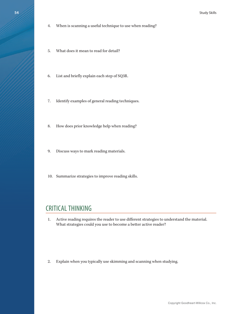 54 Study Skills Copyright Goodheart-Willcox Co., Inc. 54 4. When is scanning a useful technique to use when reading? 5. What does it mean to read for detail? 6. List and briefly explain each step of SQ3R. 7. Identify examples of general reading techniques. 8. How does prior knowledge help when reading? 9. Discuss ways to mark reading materials. 10. Summarize strategies to improve reading skills. CRITICAL THINKING 1. Active reading requires the reader to use different strategies to understand the material. What strategies could you use to become a better active reader? 2. Explain when you typically use skimming and scanning when studying.