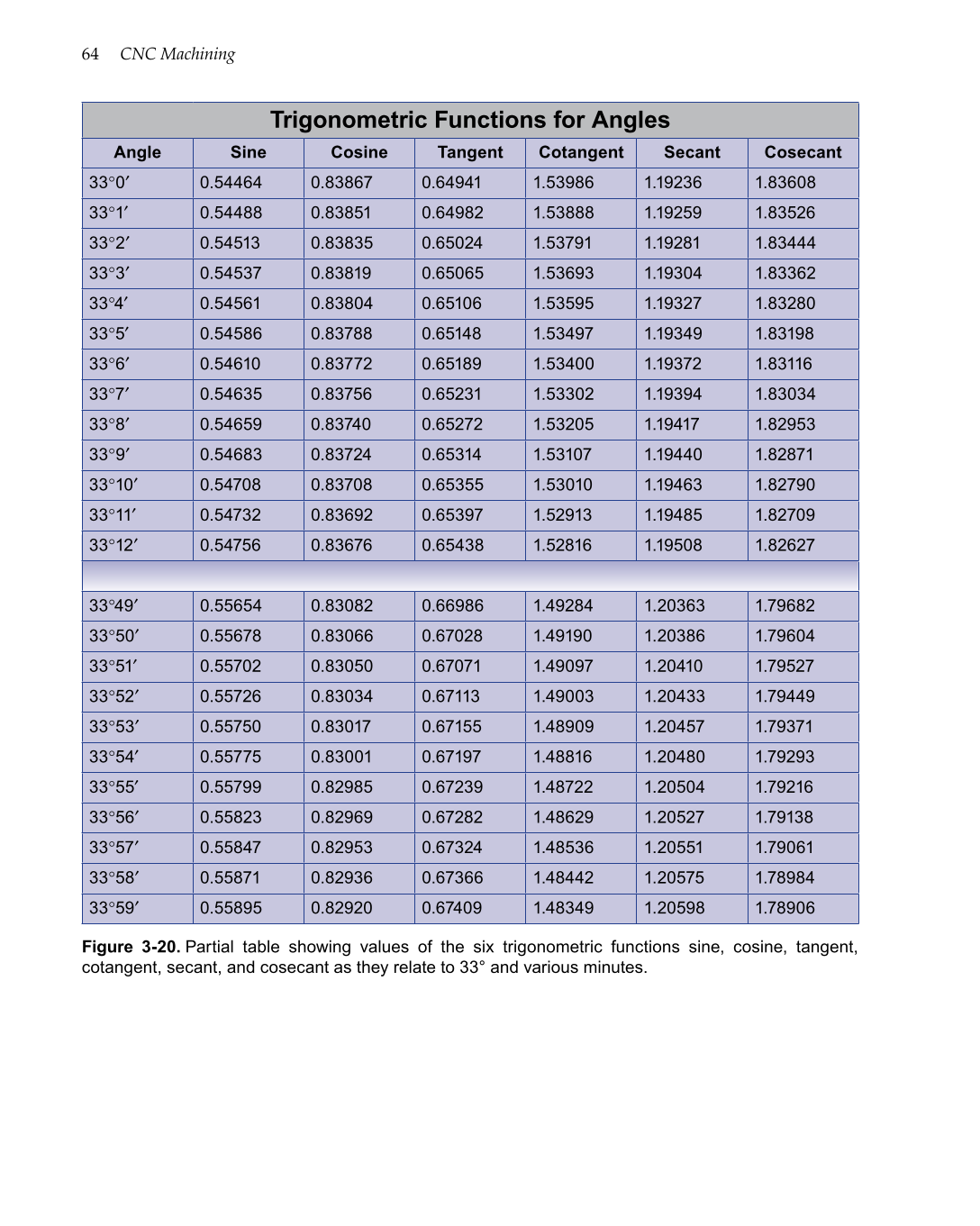 Figure 3-20. Partial table showing values of the six trigonometric functions sine, cosine, tangent,