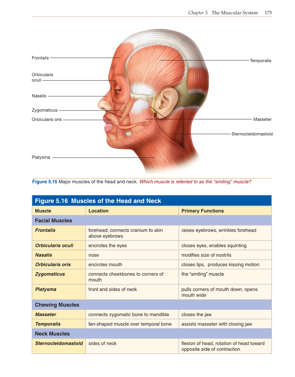 Figure 5.15 Major muscles of the head and neck. Which muscle is referred to as the “smiling” muscle?