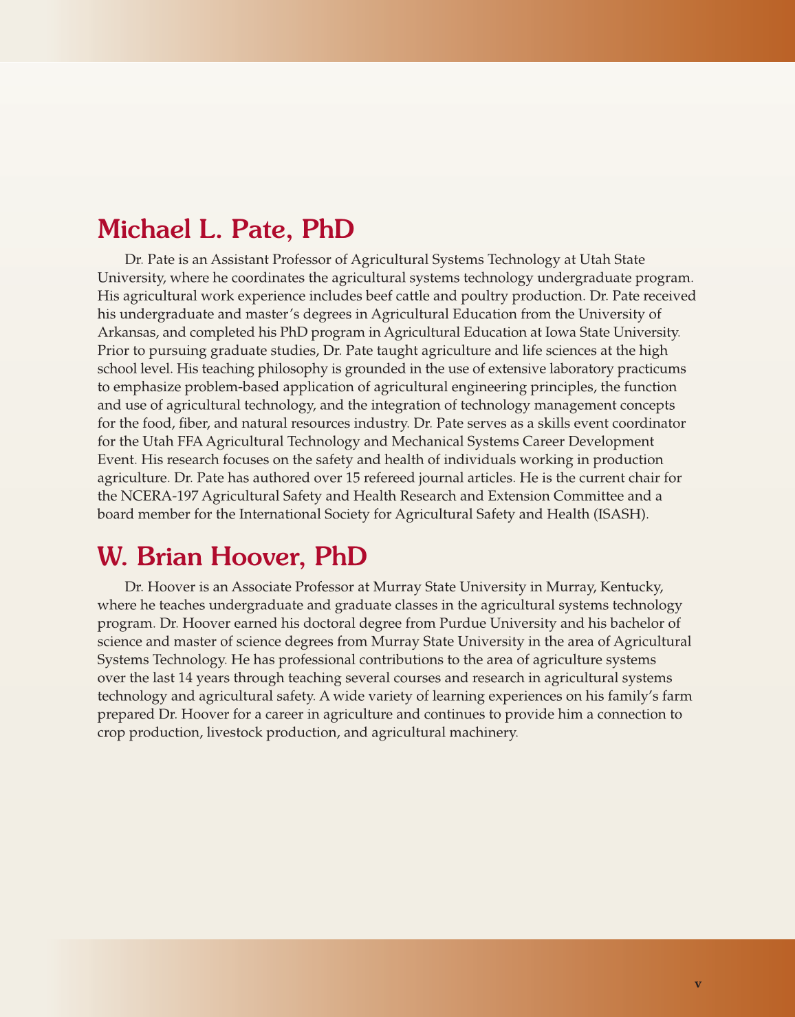 Prior to pursuing graduate studies, Dr. Pate taught agriculture and life sciences at the high