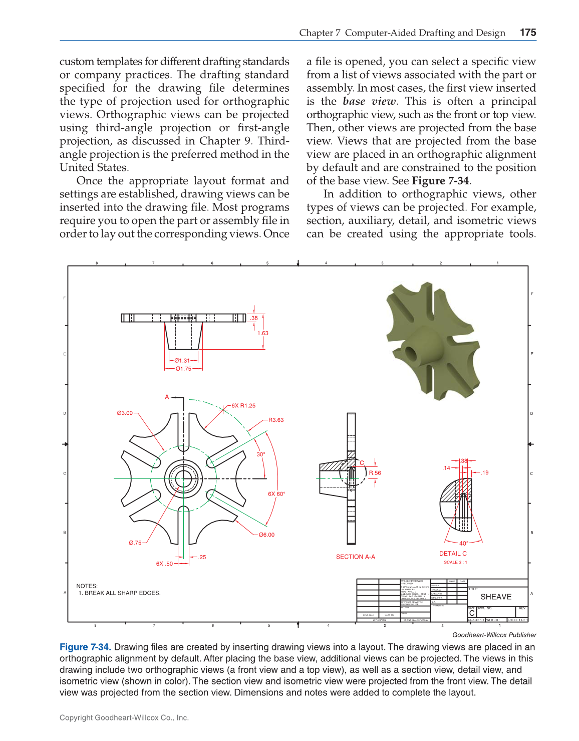 section, auxiliary, detail, and isometric views
