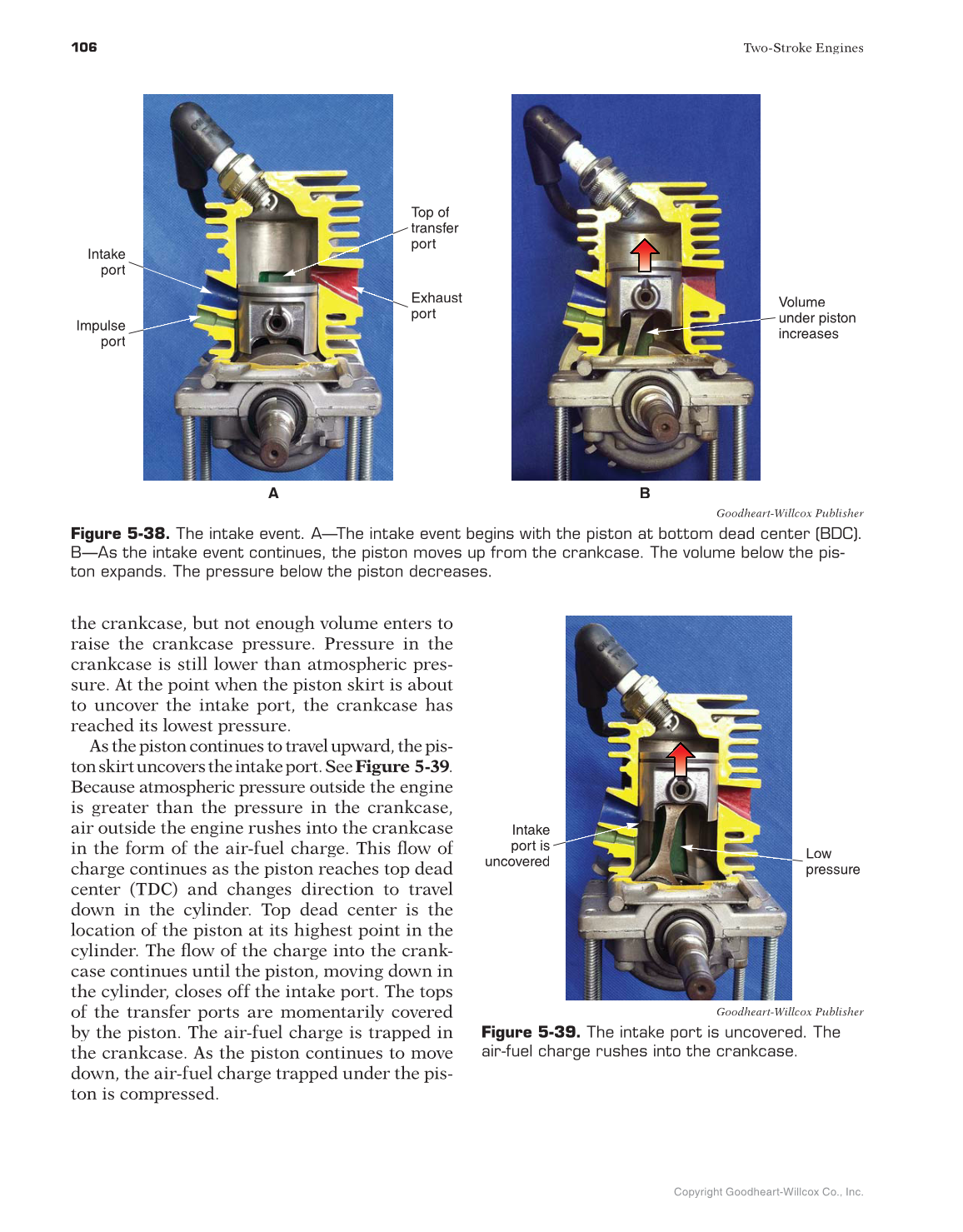 Figure 5-38. The intake event. A—The intake event begins with the piston at bottom dead center (BDC).