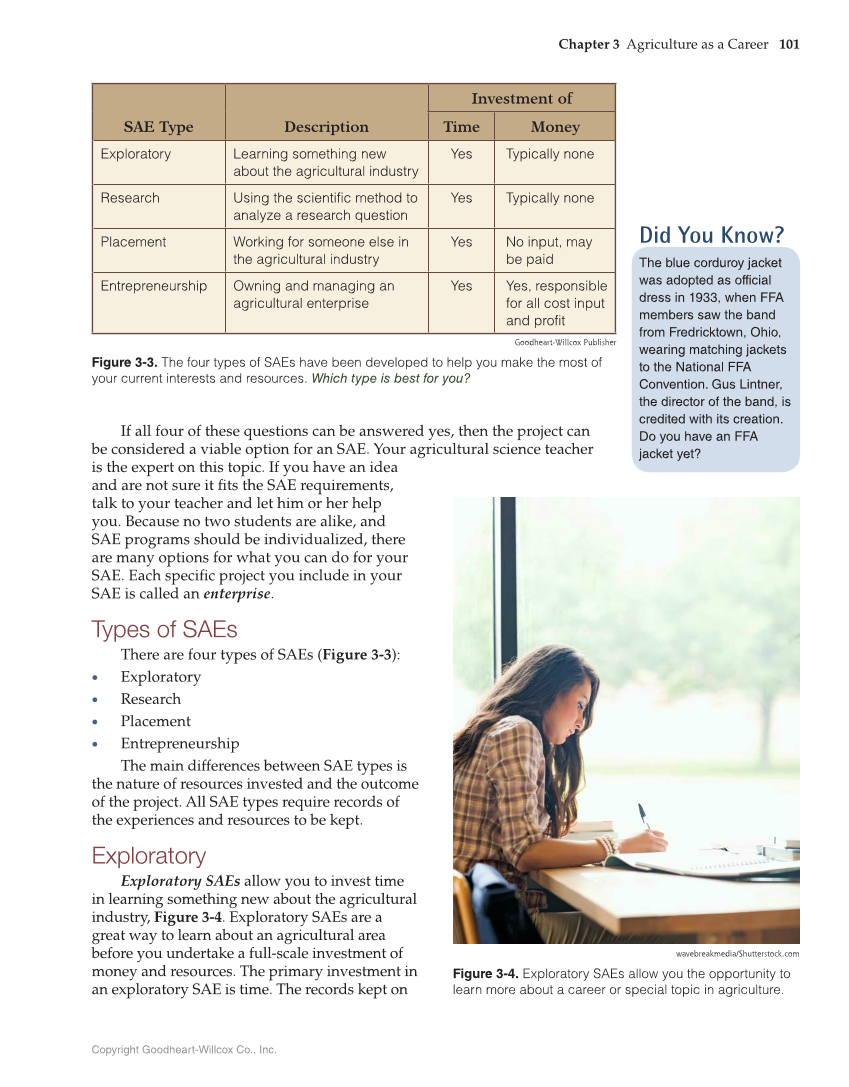 Chapter 3 Agriculture as a Career 101 Copyright Goodheart-Willcox Co., Inc. If all four of these questions can be answered yes, then the project can be considered a viable option for an SAE. Your agricultural science teacher is the expert on this topic. If you have an idea and are not sure it fits the SAE requirements, talk to your teacher and let him or her help you. Because no two students are alike, and SAE programs should be individualized, there are many options for what you can do for your SAE. Each specific project you include in your SAE is called an enterprise. Types of SAEs There are four types of SAEs (Figure 3-3): „ Exploratory „ Research „ Placement „ Entrepreneurship The main differences between SAE types is the nature of resources invested and the outcome of the project. All SAE types require records of the experiences and resources to be kept. Exploratory Exploratory SAEs allow you to invest time in learning something new about the agricultural industry, Figure 3-4. Exploratory SAEs are a great way to learn about an agricultural area before you undertake a full-scale investment of money and resources. The primary investment in an exploratory SAE is time. The records kept on Did You Know? The blue corduroy jacket was adopted as official dress in 1933, when FFA members saw the band from Fredricktown, Ohio, wearing matching jackets to the National FFA Convention. Gus Lintner, the director of the band, is credited with its creation. Do you have an FFA jacket yet? SAE Type Description Investment of Time Money Exploratory Learning something new about the agricultural industry Yes Typically none Research Using the scientific method to analyze a research question Yes Typically none Placement Working for someone else in the agricultural industry Yes No input, may be paid Entrepreneurship Owning and managing an agricultural enterprise Yes Yes, responsible for all cost input and profit Goodheart-Willcox Publisher Figure 3-3. The four types of SAEs have been developed to help you make the most of your current interests and resources. Which type is best for you? wavebreakmedia/Shutterstock.com Figure 3-4. Exploratory SAEs allow you the opportunity to learn more about a career or special topic in agriculture.