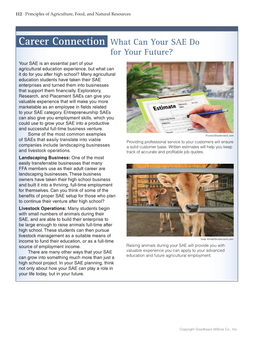 112 Principles of Agriculture, Food, and Natural Resources Copyright Goodheart-Willcox Co., Inc. Career Connection Your SAE is an essential part of your agricultural education experience, but what can it do for you after high school? Many agricultural education students have taken their SAE enterprises and turned them into businesses that support them financially. Exploratory, Research, and Placement SAEs can give you valuable experience that will make you more marketable as an employee in fields related to your SAE category. Entrepreneurship SAEs can also give you employment skills, which you could use to grow your SAE into a productive and successful full-time business venture. Some of the most common examples of SAEs that easily translate into viable companies include landscaping businesses and livestock operations. Landscaping Business: One of the most easily transferrable businesses that many FFA members use as their adult career are landscaping businesses. These business owners have taken their high school business and built it into a thriving, full-time employment for themselves. Can you think of some of the benefits of proper SAE setup for those who plan to continue their venture after high school? Livestock Operations: Many students begin with small numbers of animals during their SAE, and are able to build their enterprise to be large enough to raise animals full-time after high school. These students can then pursue livestock management as a suitable means of income to fund their education, or as a full-time source of employment income. There are many other ways that your SAE can grow into something much more than just a high school project. In your SAE planning, think not only about how your SAE can play a role in your life today, but in your future. What Can Your SAE Do for Your Future? Pixsooz/Shutterstock.com Providing professional service to your customers will ensure a solid customer base. Written estimates will help you keep track of accurate and profitable job quotes. Nate Allred/Shutterstock.com Raising animals during your SAE will provide you with valuable experience you can apply to your advanced education and future agricultural employment.