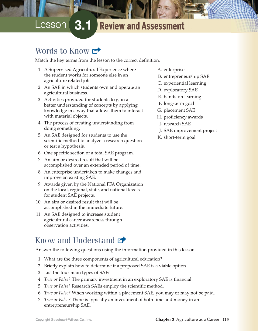 Chapter 3 Agriculture as a Career 115 Copyright Goodheart-Willcox Co., Inc. Lesson Review and Assessment 3.1 Words to Know Match the key terms from the lesson to the correct definition. 1. A Supervised Agricultural Experience where the student works for someone else in an agriculture related job. 2. An SAE in which students own and operate an agricultural business. 3. Activities provided for students to gain a better understanding of concepts by applying knowledge in a way that allows them to interact with material objects. 4. The process of creating understanding from doing something. 5. An SAE designed for students to use the scientific method to analyze a research question or test a hypothesis. 6. One specific section of a total SAE program. 7. An aim or desired result that will be accomplished over an extended period of time. 8. An enterprise undertaken to make changes and improve an existing SAE. 9. Awards given by the National FFA Organization on the local, regional, state, and national levels for student SAE projects. 10. An aim or desired result that will be accomplished in the immediate future. 11. An SAE designed to increase student agricultural career awareness through observation activities. Know and Understand Answer the following questions using the information provided in this lesson. 1. What are the three components of agricultural education? 2. Briefly explain how to determine if a proposed SAE is a viable option. 3. List the four main types of SAEs. 4. True or False? The primary investment in an exploratory SAE is financial. 5. True or False? Research SAEs employ the scientific method. 6. True or False? When working within a placement SAE, you may or may not be paid. 7. True or False? There is typically an investment of both time and money in an entrepreneurship SAE. A. enterprise B. entrepreneurship SAE C. experiential learning D. exploratory SAE E. hands-on learning F. long-term goal G. placement SAE H. proficiency awards I. research SAE J. SAE improvement project K. short-term goal
