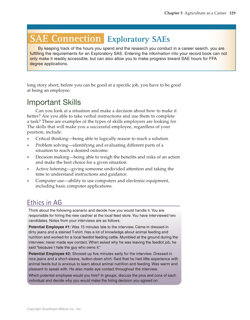 Chapter 3 Agriculture as a Career 129 Copyright Goodheart-Willcox Co., Inc. long story short, before you can be good at a specific job, you have to be good at being an employee. Important Skills Can you look at a situation and make a decision about how to make it better? Are you able to take verbal instructions and use them to complete a task? These are examples of the types of skills employers are looking for. The skills that will make you a successful employee, regardless of your position, include: „ Critical thinking—being able to logically reason to reach a solution. „ Problem solving—identifying and evaluating different parts of a situation to reach a desired outcome. „ Decision making—being able to weigh the benefits and risks of an action and make the best choice for a given situation. „ Active listening—giving someone undivided attention and taking the time to understand instructions and guidance. „ Computer use—ability to use computers and electronic equipment, including basic computer applications. SAE Connection Exploratory SAEs By keeping track of the hours you spend and the research you conduct in a career search, you are fulfilling the requirements for an Exploratory SAE. Entering the information into your record book can not only make it readily accessible, but can also allow you to make progress toward SAE hours for FFA degree applications. Ethics in AG Think about the following scenario and decide how you would handle it. You are responsible for hiring the new cashier at the local feed store. You have interviewed two candidates. Notes from your interviews are as follows: Potential Employee #1: Was 15 minutes late to the interview. Came in dressed in dirty jeans and a stained T-shirt. Has a lot of knowledge about animal feeding and nutrition and worked for a local feedlot feeding cattle. Mumbled at the ground during the interview never made eye contact. When asked why he was leaving the feedlot job, he said “because I hate the guy who owns it.” Potential Employee #2: Showed up five minutes early for the interview. Dressed in nice jeans and a short-sleeve, button-down shirt. Said that he had little experience with animal feeds but is anxious to learn about animal nutrition and feeding. Was warm and pleasant to speak with. He also made eye contact throughout the interview. Which potential employee would you hire? In groups, discuss the pros and cons of each individual and decide why you would make the hiring decision you agreed on.