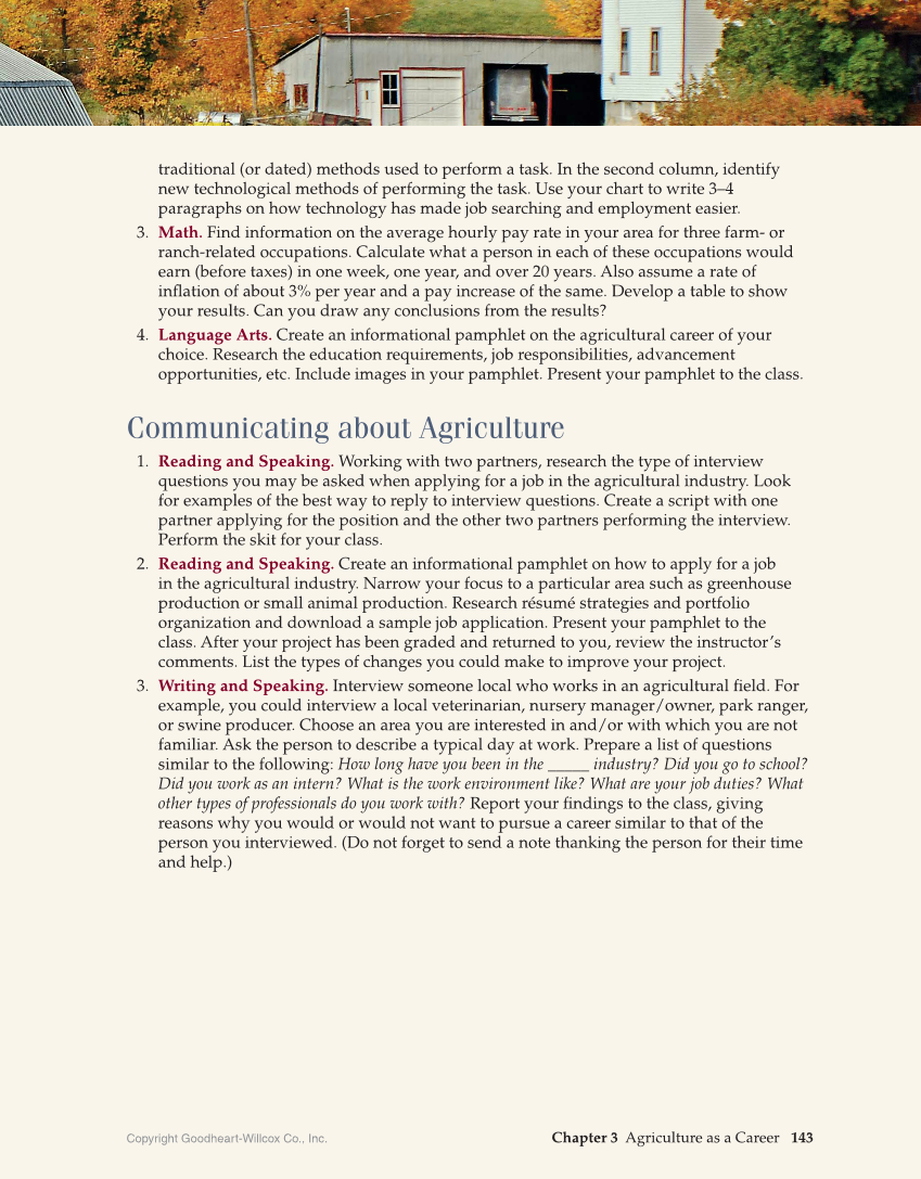 Chapter 3 Agriculture as a Career 143 Copyright Goodheart-Willcox Co., Inc. traditional (or dated) methods used to perform a task. In the second column, identify new technological methods of performing the task. Use your chart to write 3–4 paragraphs on how technology has made job searching and employment easier. 3. Math. Find information on the average hourly pay rate in your area for three farm- or ranch-related occupations. Calculate what a person in each of these occupations would earn (before taxes) in one week, one year, and over 20 years. Also assume a rate of inflation of about 3% per year and a pay increase of the same. Develop a table to show your results. Can you draw any conclusions from the results? 4. Language Arts. Create an informational pamphlet on the agricultural career of your choice. Research the education requirements, job responsibilities, advancement opportunities, etc. Include images in your pamphlet. Present your pamphlet to the class. Communicating about Agriculture 1. Reading and Speaking. Working with two partners, research the type of interview questions you may be asked when applying for a job in the agricultural industry. Look for examples of the best way to reply to interview questions. Create a script with one partner applying for the position and the other two partners performing the interview. Perform the skit for your class. 2. Reading and Speaking. Create an informational pamphlet on how to apply for a job in the agricultural industry. Narrow your focus to a particular area such as greenhouse production or small animal production. Research résumé strategies and portfolio organization and download a sample job application. Present your pamphlet to the class. After your project has been graded and returned to you, review the instructor’s comments. List the types of changes you could make to improve your project. 3. Writing and Speaking. Interview someone local who works in an agricultural field. For example, you could interview a local veterinarian, nursery manager/owner, park ranger, or swine producer. Choose an area you are interested in and/or with which you are not familiar. Ask the person to describe a typical day at work. Prepare a list of questions similar to the following: How long have you been in the _____ industry? Did you go to school? Did you work as an intern? What is the work environment like? What are your job duties? What other types of professionals do you work with? Report your findings to the class, giving reasons why you would or would not want to pursue a career similar to that of the person you interviewed. (Do not forget to send a note thanking the person for their time and help.)