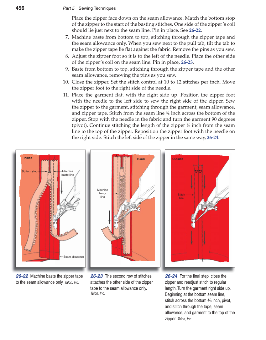 456 Part 5 Sewing Techniques Place the zipper face down on the seam allowance. Match the bottom stop of the zipper to the start of the basting stitches. One side of the zipper’s coil should lie just next to the seam line. Pin in place. See 26-22. 7. Machine baste from bottom to top, stitching through the zipper tape and the seam allowance only. When you sew next to the pull tab, tilt the tab to make the zipper tape lie fl at against the fabric. Remove the pins as you sew. 8. Adjust the zipper foot so it is to the left of the needle. Place the other side of the zipper’s coil on the seam line. Pin in place, 26-23. 9. Baste from bottom to top, stitching through the zipper tape and the other seam allowance, removing the pins as you sew. 10. Close the zipper. Set the stitch control at 10 to 12 stitches per inch. Move the zipper foot to the right side of the needle. 11. Place the garment fl at, with the right side up. Position the zipper foot with the needle to the left side to sew the right side of the zipper. Sew the zipper to the garment, stitching through the garment, seam allowance, and zipper tape. Stitch from the seam line ⅜ inch across the bottom of the zipper. Stop with the needle in the fabric and turn the garment 90 degrees (pivot). Continue stitching the length of the zipper ⅜ inch from the seam line to the top of the zipper. Reposition the zipper foot with the needle on the right side. Stitch the left side of the zipper in the same way, 26-24. Machine baste line Bottom stop Inside Seam allowance Inside Machine baste line In s i de Machine baste lin e 26-22 Machine baste the zipper tape to the seam allowance only. Talon, Inc. 26-23 The second row of stitches attaches the other side of the zipper tape to the seam allowance only. Talon, Inc. Stitch line Outside ⅜″ ″ ⅜″ ⅜ ″ 26-24 For the fi nal step, close the zipper and readjust stitch to regular length. Turn the garment right side up. Beginning at the bottom seam line, stitch across the bottom ⅜ inch, pivot, and stitch through the tape, seam allowance, and garment to the top of the zipper. Talon, Inc.