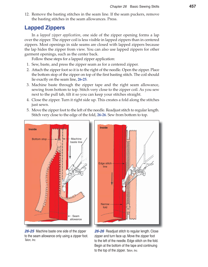 Chapter 26 Basic Sewing Skills 457 12. Remove the basting stitches in the seam line. If the seam puckers, remove the basting stitches in the seam allowances. Press. Lapped Zippers In a lapped zipper application, one side of the zipper opening forms a lap over the zipper. The zipper coil is less visible in lapped zippers than in centered zippers. Most openings in side seams are closed with lapped zippers because the lap hides the zipper from view. You can also use lapped zippers for other garment openings, such as the center back. Follow these steps for a lapped zipper application: 1. Sew, baste, and press the zipper seam as for a centered zipper. 2. Attach the zipper foot so it is to the right of the needle. Open the zipper. Place the bottom stop of the zipper on top of the fi rst basting stitch. The coil should lie exactly on the seam line, 26-25. 3. Machine baste through the zipper tape and the right seam allowance, sewing from bottom to top. Stitch very close to the zipper coil. As you sew next to the pull tab, tilt it so you can keep your stitches straight. 4. Close the zipper. Turn it right side up. This creates a fold along the stitches just sewn. 5. Move the zipper foot to the left of the needle. Readjust stitch to regular length. Stitch very close to the edge of the fold, 26-26. Sew from bottom to top. Bottom stop Inside Machine baste line Seam allowance Inside Edge stitch line Narrow fold 26-25 Machine baste one side of the zipper to the seam allowance only using a zipper foot. Talon, Inc. 26-26 Readjust stitch to regular length. Close zipper and turn face up. Move the zipper foot to the left of the needle. Edge stitch on the fold. Begin at the bottom of the tape and continuing to the top of the zipper. Talon, Inc.
