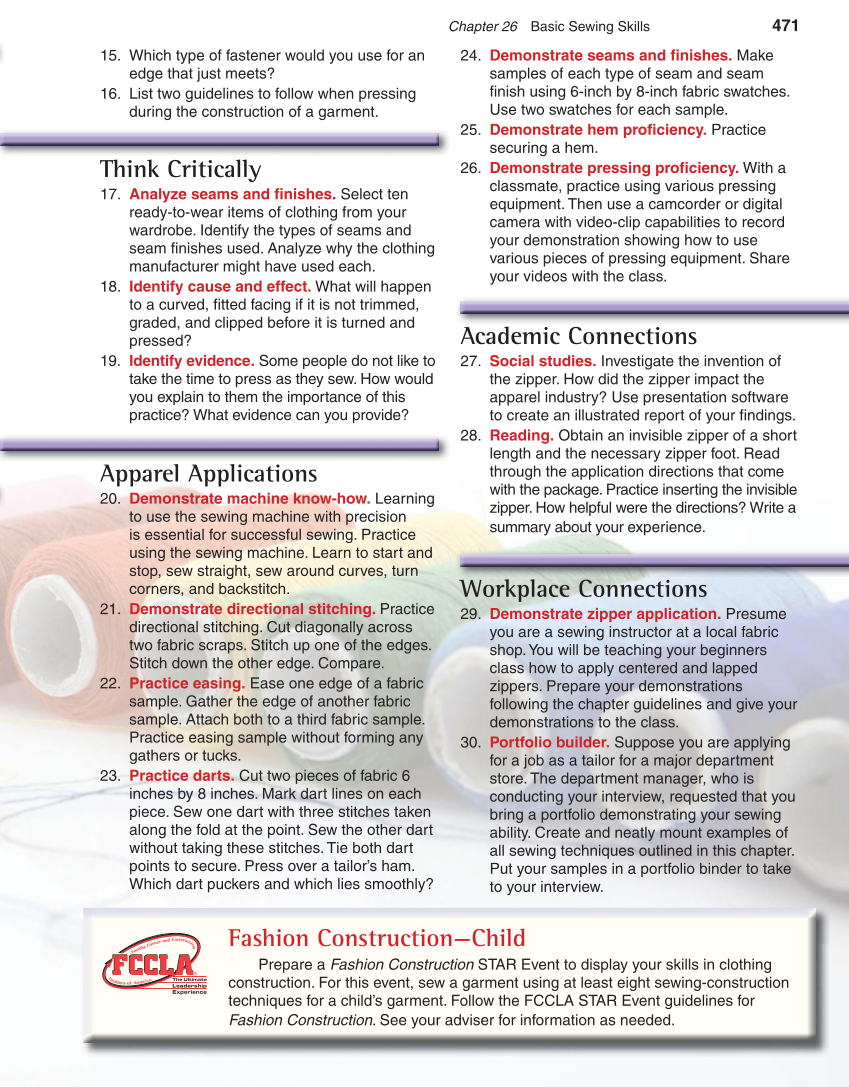Chapter 26 Basic Sewing Skills 471 15. Which type of fastener would you use for an edge that just meets? 16. List two guidelines to follow when pressing during the construction of a garment. Think Critically 17. Analyze seams and fi nishes. Select ten ready-to-wear items of clothing from your wardrobe. Identify the types of seams and seam fi nishes used. Analyze why the clothing manufacturer might have used each. 18. Identify cause and effect. What will happen to a curved, fi tted facing if it is not trimmed, graded, and clipped before it is turned and pressed? 19. Identify evidence. Some people do not like to take the time to press as they sew. How would you explain to them the importance of this practice? What evidence can you provide? Apparel Applications 20. Demonstrate machine know-how. Learning to use the sewing machine with precision is essential for successful sewing. Practice using the sewing machine. Learn to start and stop, sew straight, sew around curves, turn corners, and backstitch. 21. Demonstrate directional stitching. Practice directional stitching. Cut diagonally across two fabric scraps. Stitch up one of the edges. Stitch down the other edge. Compare. 22. Practice easing. Ease one edge of a fabric sample. Gather the edge of another fabric sample. Attach both to a third fabric sample. Practice easing sample without forming any gathers or tucks. 23. Practice darts. Cut two pieces of fabric 6 inches by 8 inches. Mark dart lines on each piece. Sew one dart with three stitches taken along the fold at the point. Sew the other dart without taking these stitches. Tie both dart points to secure. Press over a tailor’s ham. Which dart puckers and which lies smoothly? 24. Demonstrate seams and fi nishes. Make samples of each type of seam and seam fi nish using 6-inch by 8-inch fabric swatches. Use two swatches for each sample. 25. Demonstrate hem profi ciency. Practice securing a hem. 26. Demonstrate pressing profi ciency. With a classmate, practice using various pressing equipment. Then use a camcorder or digital camera with video-clip capabilities to record your demonstration showing how to use various pieces of pressing equipment. Share your videos with the class. Academic Connections 27. Social studies. Investigate the invention of the zipper. How did the zipper impact the apparel industry? Use presentation software to create an illustrated report of your fi ndings. 28. Reading. Obtain an invisible zipper of a short length and the necessary zipper foot. Read through the application directions that come with the package. Practice inserting the invisible zipper. How helpful were the directions? Write a summary about your experience. Workplace Connections 29. Demonstrate zipper application. Presume you are a sewing instructor at a local fabric shop. You will be teaching your beginners class how to apply centered and lapped zippers. Prepare your demonstrations following the chapter guidelines and give your demonstrations to the class. 30. Portfolio builder. Suppose you are applying for a job as a tailor for a major department store. The department manager, who is conducting your interview, requested that you bring a portfolio demonstrating your sewing ability. Create and neatly mount examples of all sewing techniques outlined in this chapter. Put your samples in a portfolio binder to take to your interview. Fashion Construction—Child Prepare a Fashion Construction STAR Event to display your skills in clothing construction. For this event, sew a garment using at least eight sewing-construction techniques for a child’s garment. Follow the FCCLA STAR Event guidelines for Fashion Construction. See your adviser for information as needed.