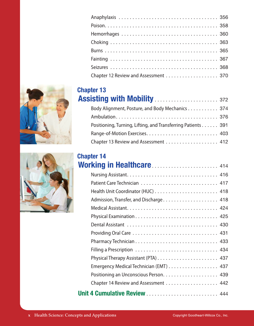 x Health Science: Concepts and Applications Copyright Goodheart-Willcox Co., Inc. Anaphylaxis . . . . . . . . . . . . . . . . . . . . . . . . . . . . . . . . . . . . 356 Poison. . . . . . . . . . . . . . . . . . . . . . . . . . . . . . . . . . . . . . . . . 358 Hemorrhages . . . . . . . . . . . . . . . . . . . . . . . . . . . . . . . . . . . 360 Choking . . . . . . . . . . . . . . . . . . . . . . . . . . . . . . . . . . . . . . . 363 Burns . . . . . . . . . . . . . . . . . . . . . . . . . . . . . . . . . . . . . . . . . 365 Fainting . . . . . . . . . . . . . . . . . . . . . . . . . . . . . . . . . . . . . . . 367 Seizures . . . . . . . . . . . . . . . . . . . . . . . . . . . . . . . . . . . . . . . 368 Chapter 12 Review and Assessment . . . . . . . . . . . . . . . . . . . 370 Chapter 13 Assisting with Mobility . . . . . . . . . . . . . . . . . . . . . . . 372 Body Alignment, Posture, and Body Mechanics . . . . . . . . . . . 374 Ambulation. . . . . . . . . . . . . . . . . . . . . . . . . . . . . . . . . . . . . 376 Positioning, Turning, Lifting, and Transferring Patients . . . . . . 391 Range-of-Motion Exercises. . . . . . . . . . . . . . . . . . . . . . . . . . 403 Chapter 13 Review and Assessment . . . . . . . . . . . . . . . . . . . 412 Chapter 14 Working in Healthcare . . . . . . . . . . . . . . . . . . . . . . . . 414 Nursing Assistant. . . . . . . . . . . . . . . . . . . . . . . . . . . . . . . . . 416 Patient Care Technician . . . . . . . . . . . . . . . . . . . . . . . . . . . . 417 Health Unit Coordinator (HUC) . . . . . . . . . . . . . . . . . . . . . . . 418 Admission, Transfer, and Discharge . . . . . . . . . . . . . . . . . . . . 418 Medical Assistant. . . . . . . . . . . . . . . . . . . . . . . . . . . . . . . . . 424 Physical Examination . . . . . . . . . . . . . . . . . . . . . . . . . . . . . . 425 Dental Assistant . . . . . . . . . . . . . . . . . . . . . . . . . . . . . . . . . 430 Providing Oral Care . . . . . . . . . . . . . . . . . . . . . . . . . . . . . . . 431 Pharmacy Technician . . . . . . . . . . . . . . . . . . . . . . . . . . . . . . 433 Filling a Prescription . . . . . . . . . . . . . . . . . . . . . . . . . . . . . . 434 Physical Therapy Assistant (PTA) . . . . . . . . . . . . . . . . . . . . . . 437 Emergency Medical Technician (EMT) . . . . . . . . . . . . . . . . . . 437 Positioning an Unconscious Person. . . . . . . . . . . . . . . . . . . . 439 Chapter 14 Review and Assessment . . . . . . . . . . . . . . . . . . . 442 Unit 4 Cumulative Review . . . . . . . . . . . . . . . . . . . . . . . . . . 444