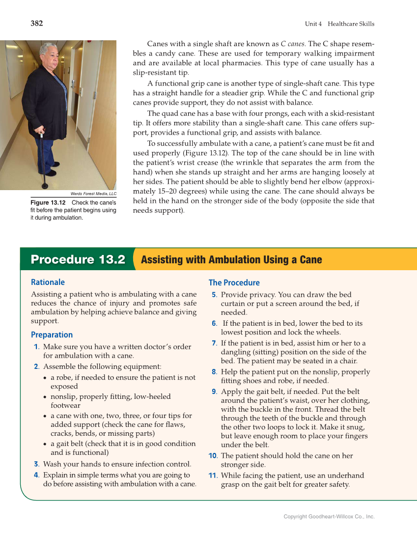 382 Unit 4 Healthcare Skills Copyright Goodheart-Willcox Co., Inc. Rationale Assisting a patient who is ambulating with a cane reduces the chance of injury and promotes safe ambulation by helping achieve balance and giving support. Preparation 1. Make sure you have a written doctor’s order for ambulation with a cane. 2. Assemble the following equipment: • a robe, if needed to ensure the patient is not exposed • nonslip, properly fi tting, low-heeled footwear • a cane with one, two, three, or four tips for added support (check the cane for fl aws, cracks, bends, or missing parts) • a gait belt (check that it is in good condition and is functional) 3. Wash your hands to ensure infection control. 4. Explain in simple terms what you are going to do before assisting with ambulation with a cane. The Procedure 5. Provide privacy. You can draw the bed curtain or put a screen around the bed, if needed. 6. If the patient is in bed, lower the bed to its lowest position and lock the wheels. 7. If the patient is in bed, assist him or her to a dangling (sitting) position on the side of the bed. The patient may be seated in a chair. 8. Help the patient put on the nonslip, properly fi tting shoes and robe, if needed. 9. Apply the gait belt, if needed. Put the belt around the patient’s waist, over her clothing, with the buckle in the front. Thread the belt through the teeth of the buckle and through the other two loops to lock it. Make it snug, but leave enough room to place your fi ngers under the belt. 10. The patient should hold the cane on her stronger side. 11. While facing the patient, use an underhand grasp on the gait belt for greater safety. Procedure 13.2 Assisting with Ambulation Using a Cane Canes with a single shaft are known as C canes. The C shape resem- bles a candy cane. These are used for temporary walking impairment and are available at local pharmacies. This type of cane usually has a slip-resistant tip. A functional grip cane is another type of single-shaft cane. This type has a straight handle for a steadier grip. While the C and functional grip canes provide support, they do not assist with balance. The quad cane has a base with four prongs, each with a skid-resistant tip. It offers more stability than a single-shaft cane. This cane offers sup- port, provides a functional grip, and assists with balance. To successfully ambulate with a cane, a patient’s cane must be fi t and used properly (Figure 13.12). The top of the cane should be in line with the patient’s wrist crease (the wrinkle that separates the arm from the hand) when she stands up straight and her arms are hanging loosely at her sides. The patient should be able to slightly bend her elbow (approxi- mately 15–20 degrees) while using the cane. The cane should always be held in the hand on the stronger side of the body (opposite the side that needs support). Wards Forest Media, LLC Figure 13.12 Check the cane’s fit before the patient begins using it during ambulation.