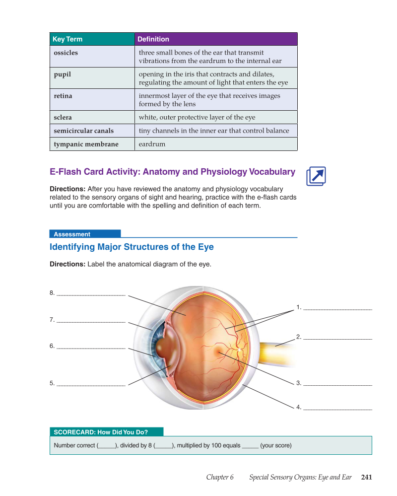 Chapter 6 Special Sensory Organs: Eye and Ear 241 Key Term Defi nition ossicles three small bones of the ear that transmit vibrations from the eardrum to the internal ear pupil opening in the iris that contracts and dilates, regulating the amount of light that enters the eye retina innermost layer of the eye that receives images formed by the lens sclera white, outer protective layer of the eye semicircular canals tiny channels in the inner ear that control balance tympanic membrane eardrum E-Flash Card Activity: Anatomy and Physiology Vocabulary Directions: After you have reviewed the anatomy and physiology vocabulary related to the sensory organs of sight and hearing, practice with the e-fl ash cards until you are comfortable with the spelling and defi nition of each term. Assessment Identifying Major Structures of the Eye Directions: Label the anatomical diagram of the eye. 1. __________________________ 2. __________________________ 3. __________________________ 4. __________________________ 8. __________________________ 7. __________________________ 6. __________________________ 5. __________________________ SCORECARD: How Did You Do? Number correct (_____), divided by 8 (_____), multiplied by 100 equals _____ (your score)