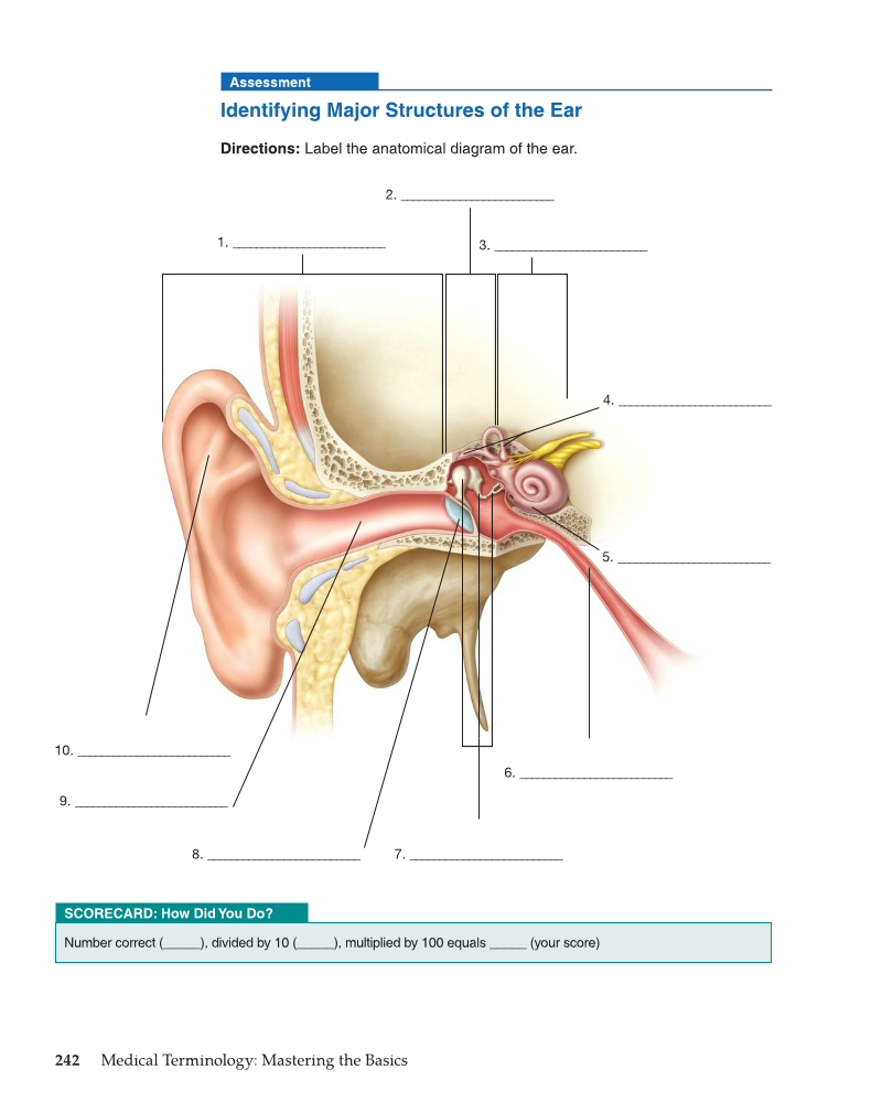 242 Medical Terminology: Mastering the Basics Assessment Identifying Major Structures of the Ear Directions: Label the anatomical diagram of the ear. 1. __________________________ 2. __________________________ 3. __________________________ 4. __________________________ 5. __________________________ 6. __________________________ 7. __________________________ 8. __________________________ 9. __________________________ 10. __________________________ SCORECARD: How Did You Do? Number correct (_____), divided by 10 (_____), multiplied by 100 equals _____ (your score)