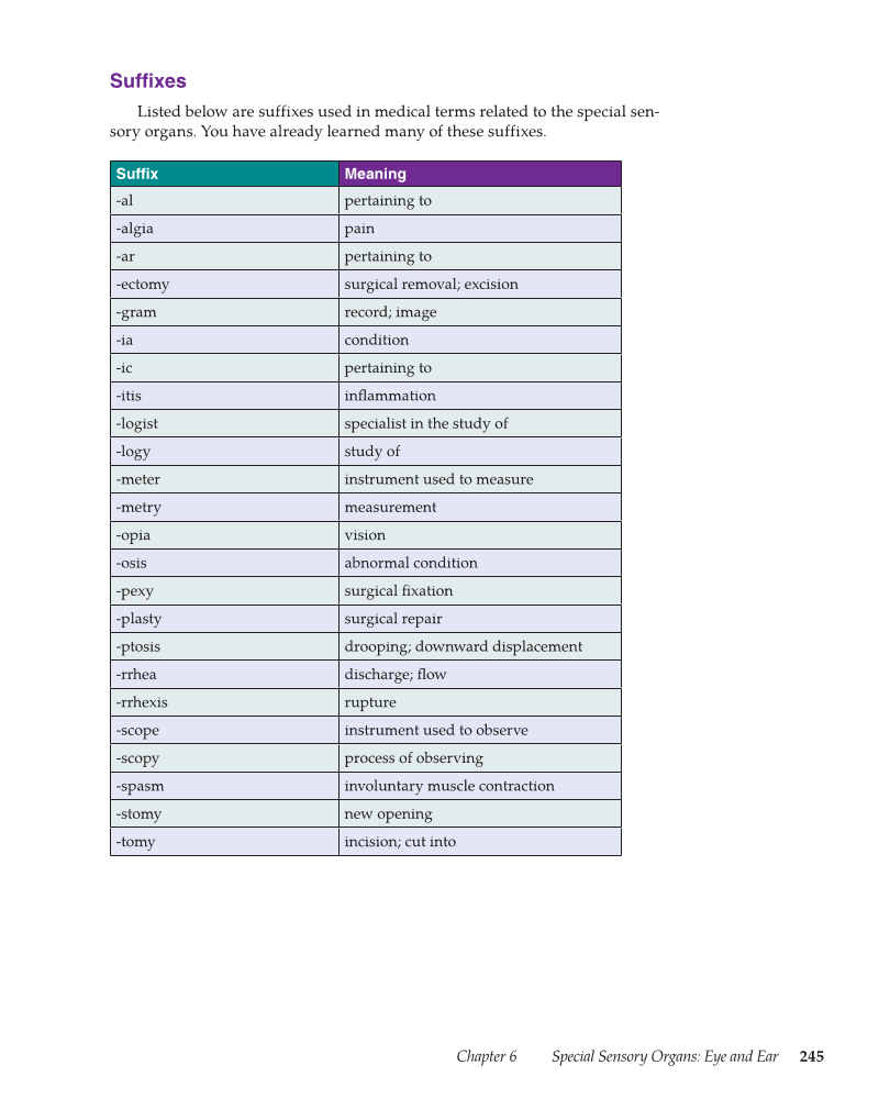 Chapter 6 Special Sensory Organs: Eye and Ear 245 Suffi xes Listed below are suffixes used in medical terms related to the special sen- sory organs. You have already learned many of these suffixes. Suffi x Meaning -al pertaining to -algia pain -ar pertaining to -ectomy surgical removal excision -gram record image -ia condition -ic pertaining to -itis infl ammation -logist specialist in the study of -logy study of -meter instrument used to measure -metry measurement -opia vision -osis abnormal condition -pexy surgical fi xation -plasty surgical repair -ptosis drooping downward displacement -rrhea discharge fl ow -rrhexis rupture -scope instrument used to observe -scopy process of observing -spasm involuntary muscle contraction -stomy new opening -tomy incision cut into
