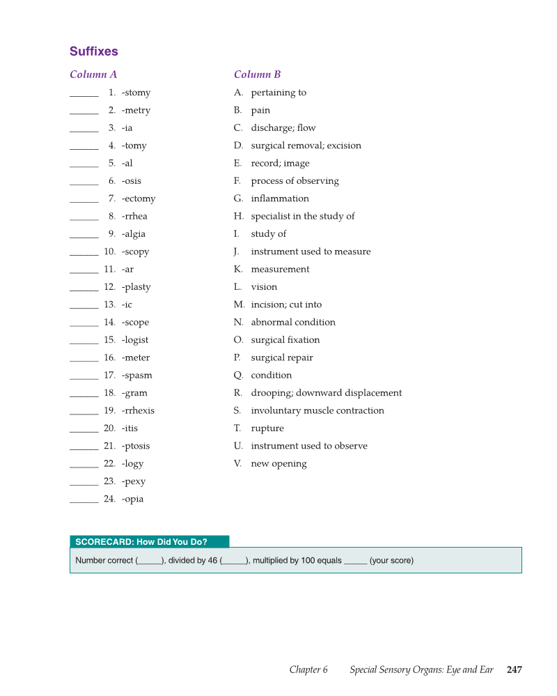 Chapter 6 Special Sensory Organs: Eye and Ear 247 Suffi xes Column A Column B ______ 1. -stomy A. pertaining to ______ 2. -metry B. pain ______ 3. -ia C. discharge fl ow ______ 4. -tomy D. surgical removal excision ______ 5. -al E. record image ______ 6. -osis F. process of observing ______ 7. -ectomy G. infl ammation ______ 8. -rrhea H. specialist in the study of ______ 9. -algia I. study of ______ 10. -scopy J. instrument used to measure ______ 11. -ar K. measurement ______ 12. -plasty L. vision ______ 13. -ic M. incision cut into ______ 14. -scope N. abnormal condition ______ 15. -logist O. surgical fi xation ______ 16. -meter P. surgical repair ______ 17. -spasm Q. condition ______ 18. -gram R. drooping downward displacement ______ 19. -rrhexis S. involuntary muscle contraction ______ 20. -itis T. rupture ______ 21. -ptosis U. instrument used to observe ______ 22. -logy V. new opening ______ 23. -pexy ______ 24. -opia SCORECARD: How Did You Do? Number correct (_____), divided by 46 (_____), multiplied by 100 equals _____ (your score)