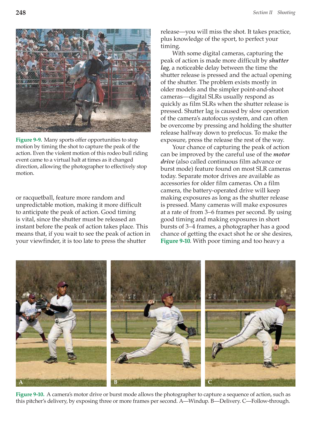 this pitcher’s delivery, by exposing three or more frames per second. A—Windup. B—Delivery. C—Follow-through.