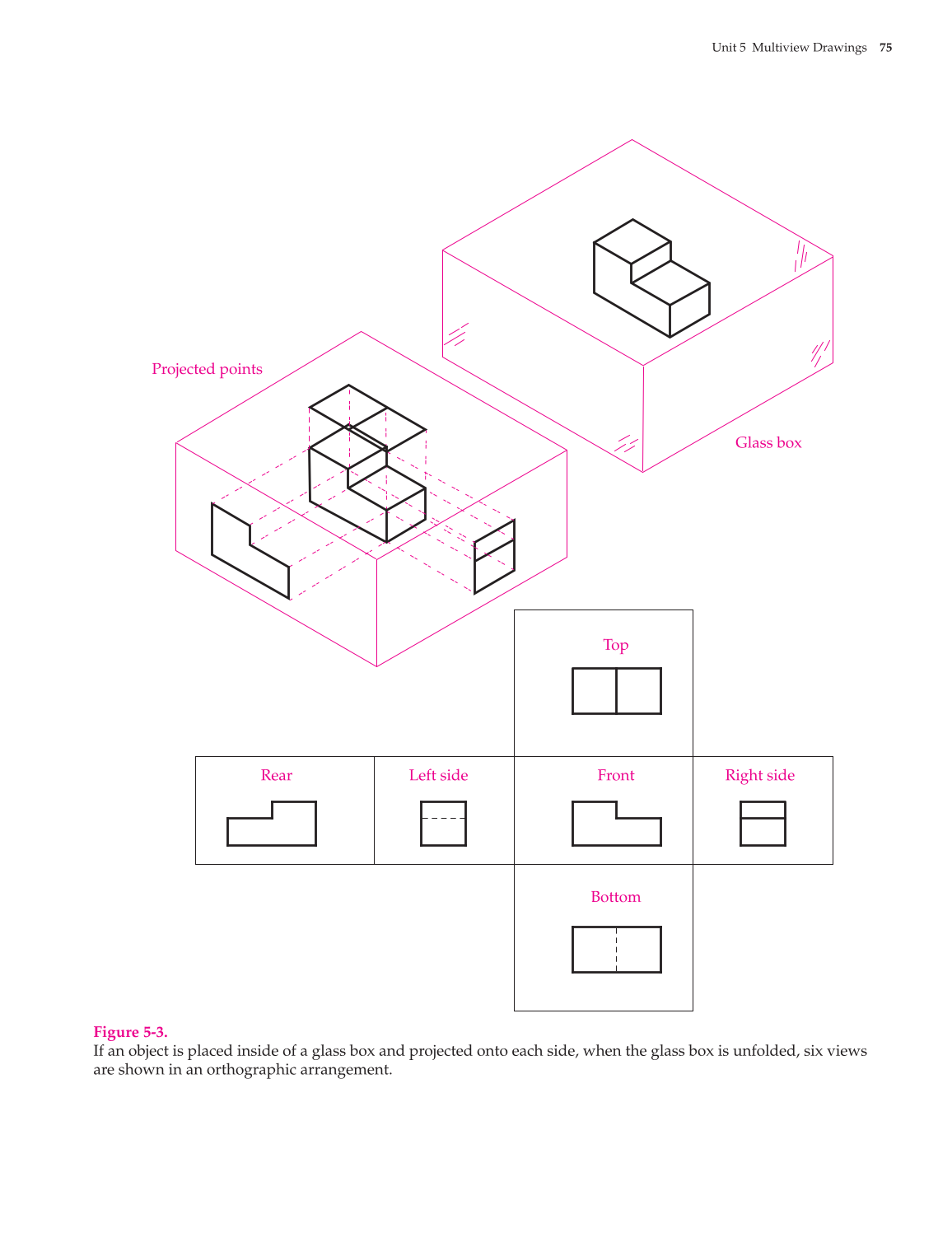 If an object is placed inside of a glass box and projected onto each side, when the glass box is unfolded, six views