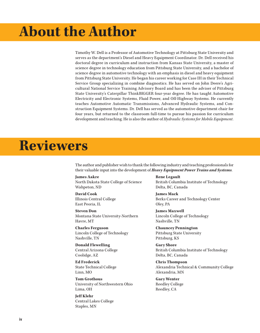 iv Timothy W. Dell is a Professor of Automotive Technology at Pittsburg State University and serves as the department’s Diesel and Heavy Equipment Coordinator. Dr. Dell received his doctoral degree in curriculum and instruction from Kansas State University, a master of science degree in technology education from Pittsburg State University, and a bachelor of science degree in automotive technology with an emphasis in diesel and heavy equipment from Pittsburg State University. He began his career working for Case IH in their Technical Service Group specializing in combine diagnostics. He has served on John Deere’s Agri- cultural National Service Training Advisory Board and has been the adviser of Pittsburg State University’s Caterpillar ThinkBIGGER four-year degree. He has taught Automotive Electricity and Electronic Systems, Fluid Power, and Off-Highway Systems. He currently teaches Automotive Automatic Transmissions, Advanced Hydraulic Systems, and Con- struction Equipment Systems. Dr. Dell has served as the automotive department chair for four years, but returned to the classroom full-time to pursue his passion for curriculum development and teaching. He is also the author of Hydraulic Systems for Mobile Equipment. About the Author Reviewers The author and publisher wish to thank the following industry and teaching professionals for their valuable input into the development of Heavy Equipment Power Trains and Systems. James Aakre North Dakota State College of Science Wahpeton, ND David Cook Illinois Central College East Peoria, IL Steven Don Montana State University-Northern Havre, MT Charles Ferguson Lincoln College of Technology Nashville, TN Donald Flewelling Central Arizona College Coolidge, AZ Ed Frederick State Technical College Linn, MO Tom Grothous University of Northwestern Ohio Lima, OH Jeff Klehr Central Lakes College Staples, MN Rene Legault British Columbia Institute of Technology Delta, BC, Canada James Mack Berks Career and Technology Center Oley, PA James Maxwell Lincoln College of Technology Nashville, TN Chauncey Pennington Pittsburg State University Pittsburg, KS Gary Shore British Columbia Institute of Technology Delta, BC, Canada Chris Thompson Alexandria Technical & Community College Alexandria, MN Gary Wenter Reedley College Reedley, CA