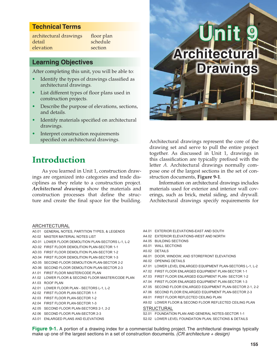 A portion of a drawing index for a commercial building project. The architectural drawings typically