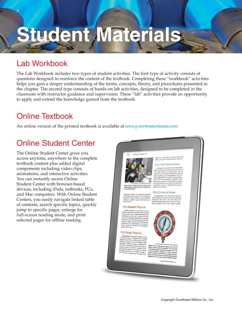 Lab Workbook The Lab Workbook includes two types of student activities. The first type of activity consists of questions designed to reinforce the content of the textbook. Completing these “workbook” activities helps you gain a deeper understanding of the terms, concepts, theory, and procedures presented in the chapter. The second type consists of hands-on lab activities, designed to be completed in the classroom with instructor guidance and supervision. These “lab” activities provide an opportunity to apply and extend the knowledge gained from the textbook. Online Textbook An online version of the printed textbook is available at www.g-wonlinetextbooks.com. Online Student Center The Online Student Center gives you access anytime, anywhere to the complete textbook content plus added digital components including video clips, animations, and interactive activities. You can instantly access Online Student Center with browser-based devices, including iPads, netbooks, PCs, and Mac computers. With Online Student Centers, you easily navigate linked table of contents, search specific topics, quickly jump to specific pages, enlarge for full-screen reading mode, and print selected pages for offline reading. Student Materials x Copyright Goodheart-Willcox Co., Inc.