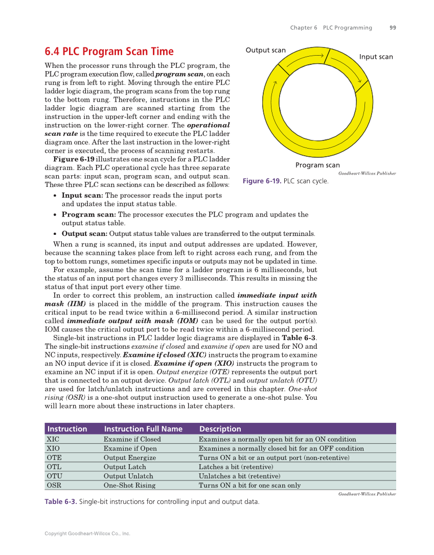 Copyright Goodheart-Willcox Co., Inc. Chapter 6 PLC Programming 99 6.4 PLC Program Scan Time When the processor runs through the PLC program, the PLC program execution flow, called program scan, on each rung is from left to right. Moving through the entire PLC ladder logic diagram, the program scans from the top rung to the bottom rung. Therefore, instructions in the PLC ladder logic diagram are scanned starting from the instruction in the upper-left corner and ending with the instruction on the lower-right corner. The operational scan rate is the time required to execute the PLC ladder diagram once. After the last instruction in the lower-right corner is executed, the process of scanning restarts. Figure 6-19 illustrates one scan cycle for a PLC ladder diagram. Each PLC operational cycle has three separate scan parts: input scan, program scan, and output scan. These three PLC scan sections can be described as follows: • Input scan: The processor reads the input ports and updates the input status table. • Program scan: The processor executes the PLC program and updates the output status table. • Output scan: Output status table values are transferred to the output terminals. When a rung is scanned, its input and output addresses are updated. However, because the scanning takes place from left to right across each rung, and from the top to bottom rungs, sometimes specific inputs or outputs may not be updated in time. For example, assume the scan time for a ladder program is 6 milliseconds, but the status of an input port changes every 3 milliseconds. This results in missing the status of that input port every other time. In order to correct this problem, an instruction called immediate input with mask (IIM) is placed in the middle of the program. This instruction causes the critical input to be read twice within a 6-millisecond period. A similar instruction called immediate output with mask (IOM) can be used for the output port(s). IOM causes the critical output port to be read twice within a 6-millisecond period. Single-bit instructions in PLC ladder logic diagrams are displayed in Table 6-3. The single-bit instructions examine if closed and examine if open are used for NO and NC inputs, respectively. Examine if closed (XIC) instructs the program to examine an NO input device if it is closed. Examine if open (XIO) instructs the program to examine an NC input if it is open. Output energize (OTE) represents the output port that is connected to an output device. Output latch (OTL) and output unlatch (OTU) are used for latch/unlatch instructions and are covered in this chapter. One-shot rising (OSR) is a one-shot output instruction used to generate a one-shot pulse. You will learn more about these instructions in later chapters. Goodheart-Willcox Publisher Table 6-3. Single-bit instructions for controlling input and output data. Instruction Instruction Full Name Description XIC Examine if Closed Examines a normally open bit for an ON condition XIO Examine if Open Examines a normally closed bit for an OFF condition OTE Output Energize Turns ON a bit or an output port (non-retentive) OTL Output Latch Latches a bit (retentive) OTU Output Unlatch Unlatches a bit (retentive) OSR One-Shot Rising Turns ON a bit for one scan only Output scan Input scan Program scan Goodheart-Willcox Publisher Figure 6-19. PLC scan cycle.
