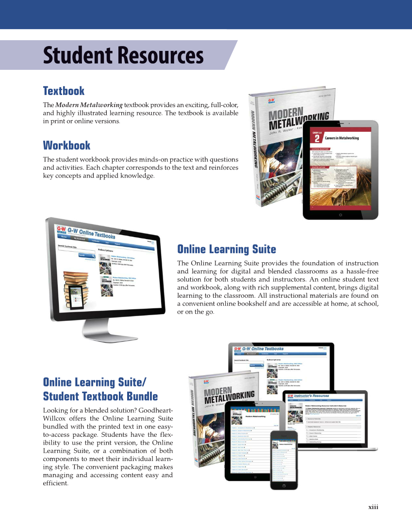 xiii Student Resources Textbook The Modern Metalworking textbook provides an exciting, full-color, g and highly illustrated learning resource. The textbook is available in print or online versions. Workbook The student workbook provides minds-on practice with questions and activities. Each chapter corresponds to the text and reinforces key concepts and applied knowledge. Online Learning Suite The Online Learning Suite provides the foundation of instruction and learning for digital and blended classrooms as a hassle-free solution for both students and instructors. An online student text and workbook, along with rich supplemental content, brings digital learning to the classroom. All instructional materials are found on a convenient online bookshelf and are accessible at home, at school, or on the go. Online Learning Suite/ Student Textbook Bundle Looking for a blended solution? Goodheart- Willcox offers the Online Learning Suite bundled with the printed text in one easy- to-access package. Students have the flex- ibility to use the print version, the Online Learning Suite, or a combination of both components to meet their individual learn- ing style. The convenient packaging makes managing and accessing content easy and efficient.