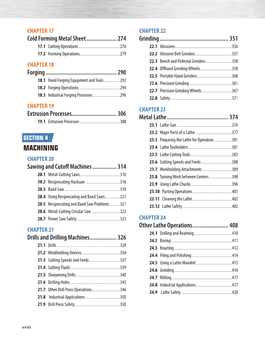 xviii CHAPTER 17 Cold Forming Metal Sheet .................... 274 17.1 Cutting Operations .........................................276 17.2 Forming Operations........................................279 CHAPTER 18 Forging ............................................... 290 18.1 Hand Forging Equipment and Tools ................292 18.2 Forging Operations .........................................294 18.3 Industrial Forging Processes ...........................296 CHAPTER 19 Extrusion Processes.............................. 306 19.1 Extrusion Processes ........................................308 SECTION 4 MACHINING CHAPTER 20 Sawing and Cutoff Machines ................ 314 20.1 Metal-Cutting Saws ........................................316 20.2 Reciprocating Hacksaw ..................................316 20.3 Band Saw .......................................................318 20.4 Using Reciprocating and Band Saws ...............321 20.5 Reciprocating and Band Saw Problems ..........321 20.6 Metal-Cutting Circular Saw ............................322 20.7 Power Saw Safety...........................................323 CHAPTER 21 Drills and Drilling Machines.................. 326 21.1 Drills...............................................................328 21.2 Workholding Devices ......................................334 21.3 Cutting Speeds and Feeds ..............................337 21.4 Cutting Fluids .................................................339 21.5 Sharpening Drills............................................340 21.6 Drilling Holes..................................................343 21.7 Other Drill Press Operations ............................346 21.8 Industrial Applications ..................................350 21.9 Drill Press Safety.............................................350 CHAPTER 22 Grinding.............................................. 351 22.1 Abrasives ........................................................356 22.2 Abrasive Belt Grinders ....................................357 22.3 Bench and Pedestal Grinders..........................358 22.4 Off hand Grinding Wheels ...............................358 22.5 Portable Hand Grinders ..................................360 22.6 Precision Grinding ..........................................361 22.7 Precision Grinding Wheels ..............................367 22.8 Safety.............................................................371 CHAPTER 23 Metal Lathe......................................... 374 23.1 Lathe Size .......................................................376 23.2 Major Parts of a Lathe ....................................377 23.3 Preparing the Lathe for Operation ..................381 23.4 Lathe Toolholders ...........................................381 23.5 Lathe Cutting Tools .........................................383 23.6 Cutting Speeds and Feeds ..............................388 23.7 Workholding Attachments .............................389 23.8 Turning Work between Centers .......................390 23.9 Using Lathe Chucks ........................................396 23.10 Parting Operations.......................................401 23.11 Cleaning the Lathe.......................................402 23.12 Lathe Safety .................................................402 CHAPTER 24 Other Lathe Operations ........................ 408 24.1 Drilling and Reaming .....................................410 24.2 Boring ............................................................411 24.3 Knurling .........................................................412 24.4 Filing and Polishing........................................414 24.5 Using a Lathe Mandrel ...................................415 24.6 Grinding .........................................................416 24.7 Milling ............................................................417 24.8 Industrial Applications ...................................417 24.9 Lathe Safety ..................................................420