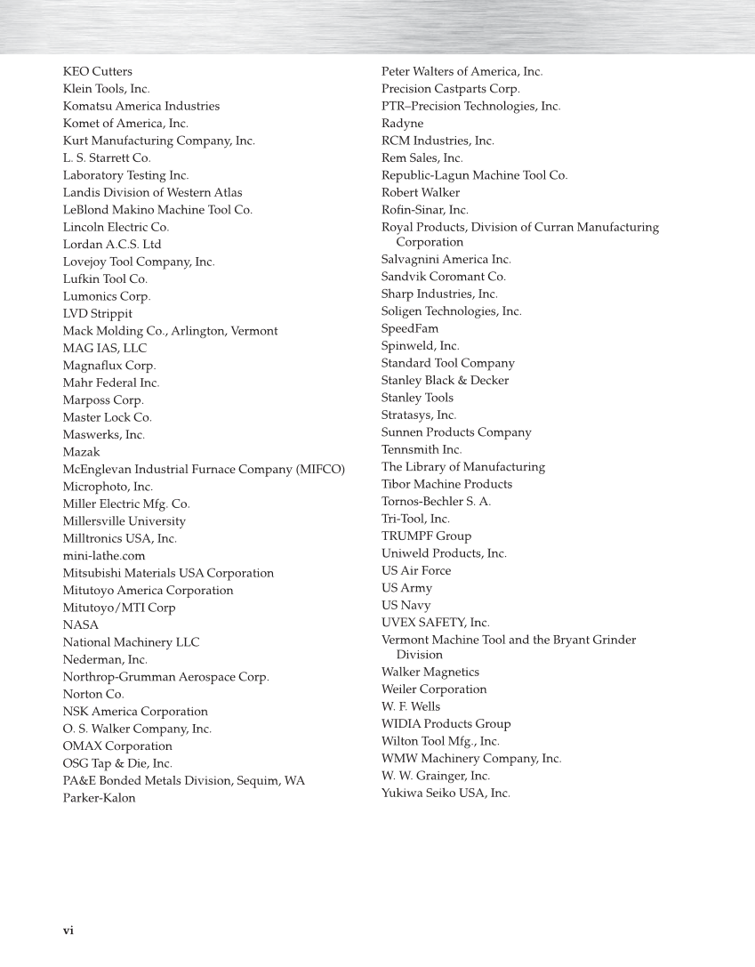 vi KEO Cutters Klein Tools, Inc. Komatsu America Industries Komet of America, Inc. Kurt Manufacturing Company, Inc. L. S. Starrett Co. Laboratory Testing Inc. Landis Division of Western Atlas LeBlond Makino Machine Tool Co. Lincoln Electric Co. Lordan A.C.S. Ltd Lovejoy Tool Company, Inc. Lufkin Tool Co. Lumonics Corp. LVD Strippit Mack Molding Co., Arlington, Vermont MAG IAS, LLC Magnafl ux Corp. Mahr Federal Inc. Marposs Corp. Master Lock Co. Maswerks, Inc. Mazak McEnglevan Industrial Furnace Company (MIFCO) Microphoto, Inc. Miller Electric Mfg. Co. Millersville University Milltronics USA, Inc. mini-lathe.com Mitsubishi Materials USA Corporation Mitutoyo America Corporation Mitutoyo/MTI Corp NASA National Machinery LLC Nederman, Inc. Northrop-Grumman Aerospace Corp. Norton Co. NSK America Corporation O. S. Walker Company, Inc. OMAX Corporation OSG Tap & Die, Inc. PA&E Bonded Metals Division, Sequim, WA Parker-Kalon Peter Walters of America, Inc. Precision Castparts Corp. PTR–Precision Technologies, Inc. Radyne RCM Industries, Inc. Rem Sales, Inc. Republic-Lagun Machine Tool Co. Robert Walker Rofi n-Sinar, Inc. Royal Products, Division of Curran Manufacturing Corporation Salvagnini America Inc. Sandvik Coromant Co. Sharp Industries, Inc. Soligen Technologies, Inc. SpeedFam Spinweld, Inc. Standard Tool Company Stanley Black & Decker Stanley Tools Stratasys, Inc. Sunnen Products Company Tennsmith Inc. The Library of Manufacturing Tibor Machine Products Tornos-Bechler S. A. Tri-Tool, Inc. TRUMPF Group Uniweld Products, Inc. US Air Force US Army US Navy UVEX SAFETY, Inc. Vermont Machine Tool and the Bryant Grinder Division Walker Magnetics Weiler Corporation W. F. Wells WIDIA Products Group Wilton Tool Mfg., Inc. WMW Machinery Company, Inc. W. W. Grainger, Inc. Yukiwa Seiko USA, Inc.