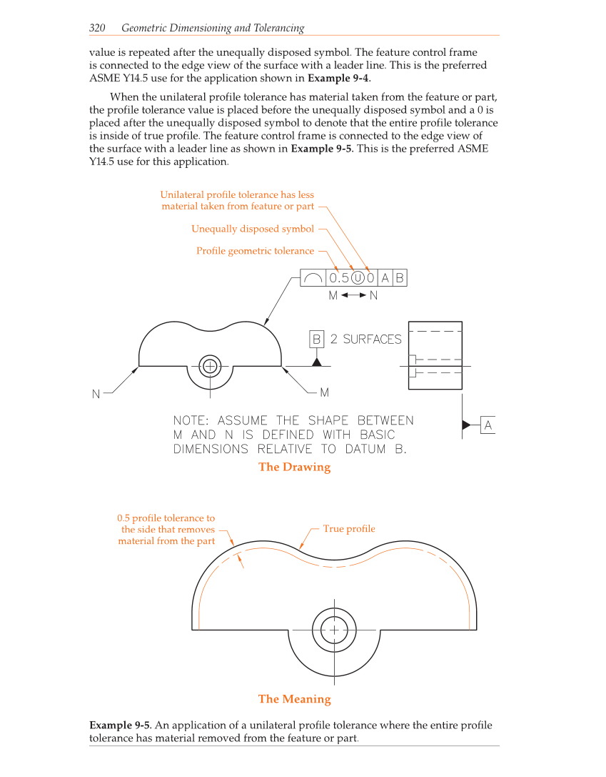 320 Geometric Dimensioning and Tolerancing value is repeated after the unequally disposed symbol. The feature control frame is connected to the edge view of the surface with a leader line. This is the preferred ASME Y14.5 use for the application shown in Example 9-4. When the unilateral profile tolerance has material taken from the feature or part, the profile tolerance value is placed before the unequally disposed symbol and a 0 is placed after the unequally disposed symbol to denote that the entire profile tolerance is inside of true profile. The feature control frame is connected to the edge view of the surface with a leader line as shown in Example 9-5. This is the preferred ASME Y14.5 use for this application. The Drawing The Meaning Unilateral profile tolerance has less material taken from feature or part Unequally disposed symbol Profile geometric tolerance 0.5 profile tolerance to the side that removes material from the part True profile Example 9-5. An application of a unilateral profi le tolerance where the entire profi le tolerance has material removed from the feature or part.