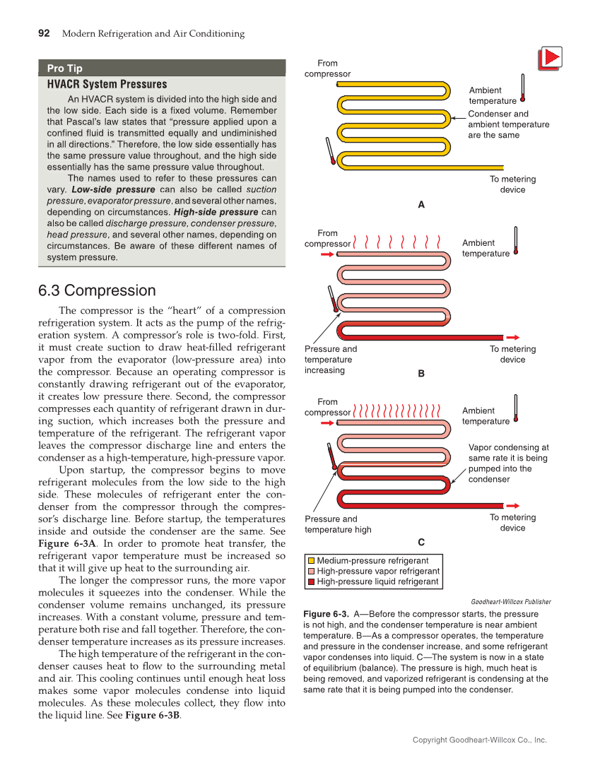 92 Modern Refrigeration and Air Conditioning Copyright Goodheart-Willcox Co., Inc. Pro Tip HVACR System Pressures An HVACR system is divided into the high side and the low side. Each side is a fixed volume. Remember that Pascal’s law states that “pressure applied upon a confined fluid is transmitted equally and undiminished in all directions.” Therefore, the low side essentially has the same pressure value throughout, and the high side essentially has the same pressure value throughout. The names used to refer to these pressures can vary. Low-side pressure can also be called suction pressure,evaporatorpressure,andseveralothernames, depending on circumstances. High-side pressure can also be called discharge pressure, condenser pressure,e head pressure, and several other names, depending on circumstances. Be aware of these different names of system pressure. 6.3 Compression The compressor is the “heart” of a compression refrigeration system. It acts as the pump of the refrig- eration system. A compressor’s role is two-fold. First, it must create suction to draw heat-filled refrigerant vapor from the evaporator (low-pressure area) into the compressor. Because an operating compressor is constantly drawing refrigerant out of the evaporator, it creates low pressure there. Second, the compressor compresses each quantity of refrigerant drawn in dur- ing suction, which increases both the pressure and temperature of the refrigerant. The refrigerant vapor leaves the compressor discharge line and enters the condenser as a high-temperature, high-pressure vapor. Upon startup, the compressor begins to move refrigerant molecules from the low side to the high side. These molecules of refrigerant enter the con- denser from the compressor through the compres- sor’s discharge line. Before startup, the temperatures inside and outside the condenser are the same. See Figure 6-3A. In order to promote heat transfer, the refrigerant vapor temperature must be increased so that it will give up heat to the surrounding air. The longer the compressor runs, the more vapor molecules it squeezes into the condenser. While the condenser volume remains unchanged, its pressure increases. With a constant volume, pressure and tem- perature both rise and fall together. Therefore, the con- denser temperature increases as its pressure increases. The high temperature of the refrigerant in the con- denser causes heat to flow to the surrounding metal and air. This cooling continues until enough heat loss makes some vapor molecules condense into liquid molecules. As these molecules collect, they flow into the liquid line. See Figure 6-3B. system pressure. HVACR System Pressure s An HVACR system is divided into the high side and th e low si de . Each si de i s a fix ed volume. Remember that Pascal’s law states that “p ressure applied upon a confined fluid is transmitted equall y and undiminished in all directions.” Therefore, the low side essentially has the same pressure value throughout, and the high side essentially has the same pressure value throughout. The names used to refer to these p ressures can vary. Low-side pressure ca n also be called suction pressure , evaporator pressure , and several other names , depending on circumstances. H igh-side pressur e ca n also be called discharge pressure , c ondenser pressur , head pressure , and several other names, depending on circumstances. B e aware of th ese different names of From compressor From compressor From compressor Ambient temperature Ambient temperature Condenser and ambient temperature are the same To metering device To metering device To metering device Pressure and temperature increasing A B Vapor condensing at same rate it is being pumped into the condenser Pressure and temperature high C High-pressure vapor refrigerant High-pressure liquid refrigerant Medium-pressure refrigerant Ambient temperature Goodheart-Willcox Publisher Figure 6-3. A—Before the compressor starts, the pressure is not high, and the condenser temperature is near ambient temperature. B—As a compressor operates, the temperature and pressure in the condenser increase, and some refrigerant vapor condenses into liquid. C—The system is now in a state of equilibrium (balance). The pressure is high, much heat is being removed, and vaporized refrigerant is condensing at the same rate that it is being pumped into the condenser.