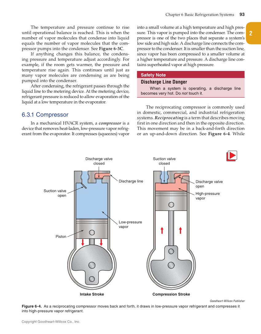 Chapter 6 Basic Refrigeration Systems 93 Copyright Goodheart-Willcox Co., Inc. 2 The temperature and pressure continue to rise until operational balance is reached. This is when the number of vapor molecules that condense into liquid equals the number of vapor molecules that the com- pressor pumps into the condenser. See Figure 6-3C. If anything changes this balance, the condens- ing pressure and temperature adjust accordingly. For example, if the room gets warmer, the pressure and temperature rise again. This continues until just as many vapor molecules are condensing as are being pumped into the condenser. After condensing, the refrigerant passes through the liquid line to the metering device. At the metering device, refrigerant pressure is reduced to allow evaporation of the liquid at a low temperature in the evaporator. 6.3.1 Compressor In a mechanical HVACR system, a compressor is a device that removes heat-laden, low-pressure vapor refrig- erant from the evaporator. It compresses (squeezes) vapor into a small volume at a high temperature and high pres- sure. This vapor is pumped into the condenser. The com- pressor is one of the two places that separate a system’s low side and high side. A discharge line connects the com- pressor to the condenser. It is smaller than the suction line, since vapor has been compressed to a smaller volume at a higher temperature and pressure. A discharge line con- tains superheated vapor at high pressure. Safety Note Discharge Line Dangerr When a system is operating, a discharge line becomes very hot. Do not touch it. The reciprocating compressor is commonly used in domestic, commercial, and industrial refrigeration systems. Reciprocating is a term that describes moving first in one direction and then in the opposite direction. This movement may be in a back-and-forth direction or an up-and-down direction. See Figure 6-4. While Discharge Line Dange When a system is operating, a discharge line becomes very hot. Do not touch it. t Discharge valve closed Suction valve closed Discharge line Discharge valve open High-pressure vapor Low-pressure vapor Suction valve open Piston Intake Stroke Compression Stroke Goodheart-Willcox Publisher Figure 6-4. As a reciprocating compressor moves back and forth, it draws in low-pressure vapor refrigerant and compresses it into high-pressure vapor refrigerant.