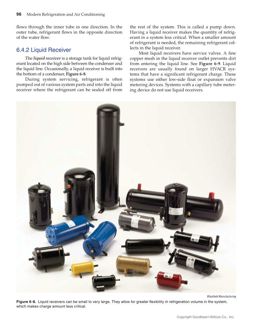 96 Modern Refrigeration and Air Conditioning Copyright Goodheart-Willcox Co., Inc. flows through the inner tube in one direction. In the outer tube, refrigerant flows in the opposite direction of the water flow. 6.4.2 Liquid Receiver The liquid receiver is a storage tank for liquid refrig- erant located on the high side between the condenser and the liquid line. Occasionally, a liquid receiver is built into the bottom of a condenser, Figure 6-8. During system servicing, refrigerant is often pumped out of various system parts and into the liquid receiver where the refrigerant can be sealed off from the rest of the system. This is called a pump down. Having a liquid receiver makes the quantity of refrig- erant in a system less critical. When a smaller amount of refrigerant is needed, the remaining refrigerant col- lects in the liquid receiver. Most liquid receivers have service valves. A fine copper mesh in the liquid receiver outlet prevents dirt from entering the liquid line. See Figure 6-9. Liquid receivers are usually found on larger HVACR sys- tems that have a significant refrigerant charge. These systems use either low-side float or expansion valve metering devices. Systems with a capillary tube meter- ing device do not use liquid receivers. Blissfield Manufacturing Figure 6-8. Liquid receivers can be small to very large. They allow for greater flexibility in refrigeration volume in the system, which makes charge amount less critical.