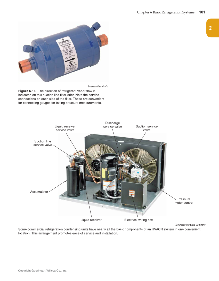 Chapter 6 Basic Refrigeration Systems 101 Copyright Goodheart-Willcox Co., Inc. 2 Emerson Electric Co. Figure 6-15. The direction of refrigerant vapor flow is indicated on this suction line filter-drier. Note the service connections on each side of the filter. These are convenient for connecting gauges for taking pressure measurements. Liquid receiver Electrical wiring box Pressure motor control Liquid receiver service valve Discharge service valve Suction service valve Suction line service valve Accumulator Tecumseh Products Company Some commercial refrigeration condensing units have nearly all the basic components of an HVACR system in one convenient location. This arrangement promotes ease of service and installation.