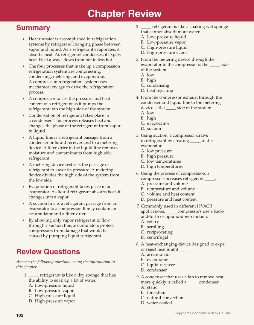 Copyright Goodheart-Willcox Co., Inc. 102 Chapter Review Summary • Heat transfer is accomplished in refrigeration systems by refrigerant changing phase between vapor and liquid. As a refrigerant evaporates, it absorbs heat. As refrigerant condenses, it expels heat. Heat always flows from hot to less hot. • The four processes that make up a compression refrigeration system are compressing, condensing, metering, and evaporating. A compression refrigeration system uses mechanical energy to drive the refrigeration process. • A compressor raises the pressure and heat content of a refrigerant as it pumps the refrigerant into the high side of the system. • Condensation of refrigerant takes place in a condenser. This process releases heat and changes the phase of the refrigerant from vapor to liquid. • A liquid line is a refrigerant passage from a condenser or liquid receiver and to a metering device. A filter-drier in the liquid line removes moisture and contaminants from high-side refrigerant. • A metering device restricts the passage of refrigerant to lower its pressure. A metering device divides the high side of the system from the low side. • Evaporation of refrigerant takes place in an evaporator. As liquid refrigerant absorbs heat, it changes into a vapor. • A suction line is a refrigerant passage from an evaporator to a compressor. It may contain an accumulator and a filter-drier. • By allowing only vapor refrigerant to flow through a suction line, accumulators protect compressors from damage that would be caused by pumping liquid refrigerant. Review Questions Answer the following questions using the information in this chapter. 1. _____ refrigerant is like a dry sponge that has the ability to soak up a lot of water. A. Low-pressure liquid B. Low-pressure vapor C. High-pressure liquid D. High-pressure vapor 2. _____ refrigerant is like a soaking wet sponge that cannot absorb more water. A. Low-pressure liquid B. Low-pressure vapor C. High-pressure liquid D. High-pressure vapor 3. From the metering device through the evaporator to the compressor is the _____ side of the system. A. low B. high C. condensing D. heat-rejecting 4. From the compressor exhaust through the condenser and liquid line to the metering device is the _____ side of the system. A. low B. high C. evaporative D. suction 5. Using suction, a compressor draws in refrigerant by creating _____ in the evaporator. A. low pressure B. high pressure C. low temperatures D. high temperatures 6. Using the process of compression, a compressor increases refrigerant _____. A. pressure and volume B. temperature and volume C. volume and heat content D. pressure and heat content 7. Commonly used in different HVACR applications, _____ compressors use a back- and-forth or up-and-down motion. A. rotary B. scrolling C. reciprocating D. centrifugal 8. A heat-exchanging device designed to expel or reject heat is a(n) _____. A. accumulator B. evaporator C. liquid receiver D. condenser 9. A condenser that uses a fan to remove heat more quickly is called a _____ condenser. A. static B. forced-air C. natural-convection D. water-cooled