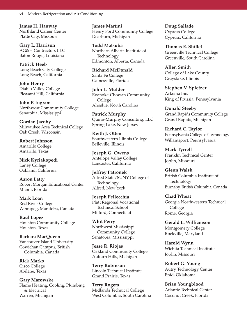 vi Modern Refrigeration and Air Conditioning James H. Hanway Northland Career Center Platte City, Missouri Gary L. Harrison AG&H Contractors LLC Baton Rouge, Louisiana Patrick Heeb Long Beach City College Long Beach, California John Henry Diablo Valley College Pleasant Hill, California John P. Ingram Northwest Community College Senatobia, Mississippi Gordan Jacoby Milwaukee Area Technical College Oak Creek, Wisconsin Robert Johnson Amarillo College Amarillo, Texas Nick Kyriakopedi Laney College Oakland, California Aaron Latty Robert Morgan Educational Center Miami, Florida Mark Loan Red River College Winnipeg, Manitoba, Canada Raul Lopez Houston Community College Houston, Texas Barbara MacQueen Vancouver Island University Cowichan Campus, British Columbia, Canada Rick Marks Cisco College Abilene, Texas Gary Marowske Flame Heating, Cooling, Plumbing & Electrical Warren, Michigan James Martini Henry Ford Community College Dearborn, Michigan Todd Matsuba Northern Alberta Institute of Technology Edmonton, Alberta, Canada Richard McDonald Santa Fe College Gainesville, Florida John L. Mulder Roanoke-Chowan Community College Ahoskie, North Carolina Patrick Murphy Quinn-Murphy Consulting, LLC Spring Lake, New Jersey Keith J. Otten Southwestern Illinois College Belleville, Illinois Joseph G. Owens Antelope Valley College Lancaster, California Jeffrey Patronek Alfred State/SUNY College of Technology Alfred, New York Joseph Pellecchia Platt Regional Vocational Technical School Milford, Connecticut Whit Perry Northwest Mississippi Community College Senatobia, Mississippi Jesse R. Riojas Oakland Community College Auburn Hills, Michigan Terry Robinson Lincoln Technical Institute Grand Prairie, Texas Terry Rogers Midlands Technical College West Columbia, South Carolina Doug Sallade Cypress College Cypress, California Thomas E. Shifl et Greenville Technical College Greenville, South Carolina Allen Smith College of Lake County Grayslake, Illinois Stephen V. Spletzer Arkema Inc. King of Prussia, Pennsylvania Donald Steeby Grand Rapids Community College Grand Rapids, Michigan Richard C. Taylor Pennsylvania College of Technology Willamsport, Pennsylvania Mark Tyrrell Franklin Technical Center Joplin, Missouri Glenn Walsh British Columbia Institute of Technology Burnaby, British Columbia, Canada Chad Wheat Georgia Northwestern Technical College Rome, Georgia Gerald L. Williamson Montgomery College Rockville, Maryland Harold Wynn Wichita Technical Institute Joplin, Missouri Robert G. Young Autry Technology Center Enid, Oklahoma Brian Youngblood Atlantic Technical Center Coconut Creek, Florida