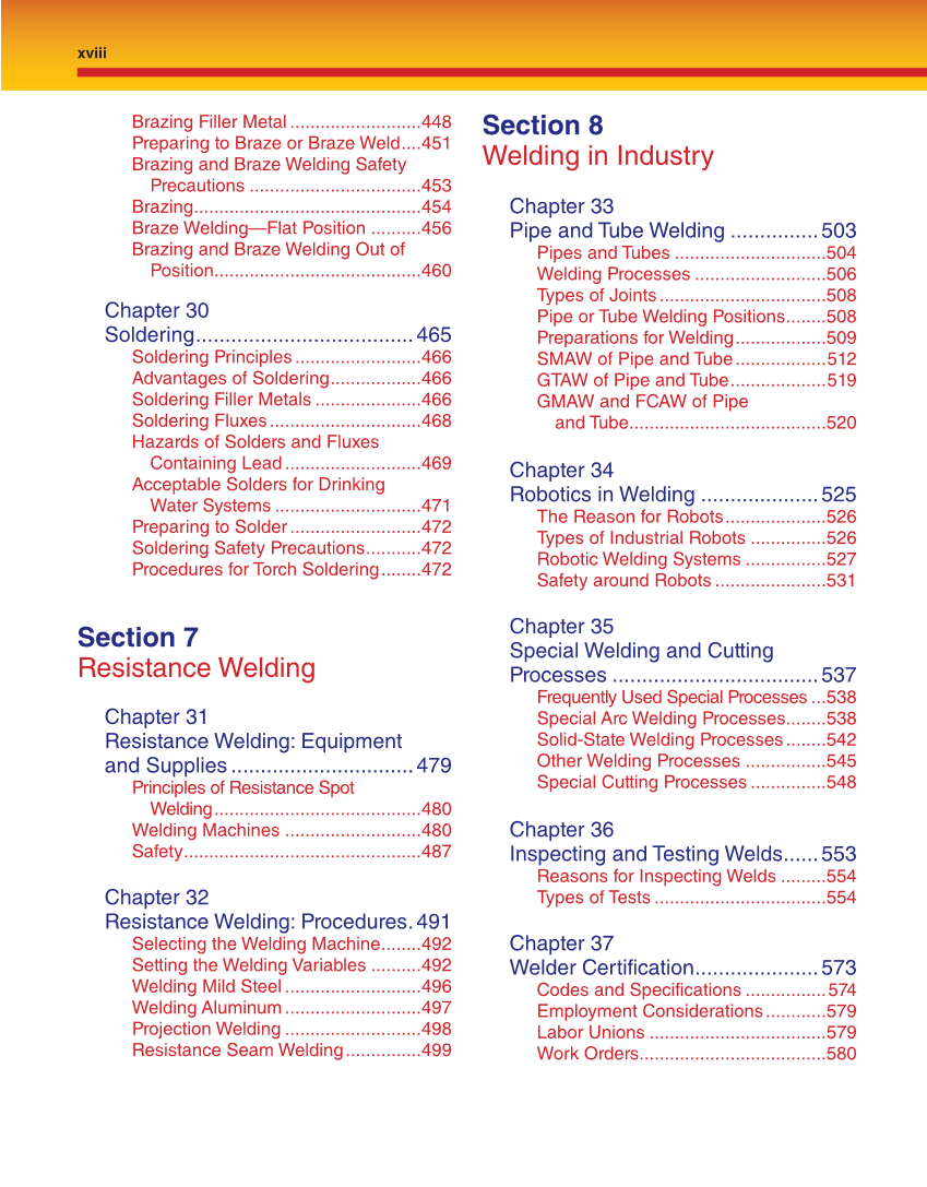 xviii Brazing Filler Metal ..........................448 Preparing to Braze or Braze Weld ....451 Brazing and Braze Welding Safety Precautions ..................................453 Brazing .............................................454 Braze Welding—Flat Position ..........456 Brazing and Braze Welding Out of Position.........................................460 Chapter 30 Soldering .....................................465 Soldering Principles .........................466 Advantages of Soldering ..................466 Soldering Filler Metals .....................466 Soldering Fluxes ..............................468 Hazards of Solders and Fluxes Containing Lead ...........................469 Acceptable Solders for Drinking Water Systems .............................471 Preparing to Solder ..........................472 Soldering Safety Precautions ...........472 Procedures for Torch Soldering ........472 Section 7 Resistance Welding Chapter 31 Resistance Welding: Equipment and Supplies ...............................479 Principles of Resistance Spot Welding .........................................480 Welding Machines ...........................480 Safety ...............................................487 Chapter 32 Resistance Welding: Procedures .491 Selecting the Welding Machine ........492 Setting the Welding Variables ..........492 Welding Mild Steel ...........................496 Welding Aluminum ...........................497 Projection Welding ...........................498 Resistance Seam Welding ...............499 Section 8 Welding in Industry Chapter 33 Pipe and Tube Welding ...............503 Pipes and Tubes ..............................504 Welding Processes ..........................506 Types of Joints .................................508 Pipe or Tube Welding Positions ........508 Preparations for Welding ..................509 SMAW of Pipe and Tube ..................512 GTAW of Pipe and Tube ...................519 GMAW and FCAW of Pipe and Tube .......................................520 Chapter 34 Robotics in Welding ....................525 The Reason for Robots ....................526 Types of Industrial Robots ...............526 Robotic Welding Systems ................527 Safety around Robots ......................531 Chapter 35 Special Welding and Cutting Processes ...................................537 Frequently Used Special Processes ...538 Special Arc Welding Processes ........538 Solid-State Welding Processes ........542 Other Welding Processes ................545 Special Cutting Processes ...............548 Chapter 36 Inspecting and Testing Welds ......553 Reasons for Inspecting Welds .........554 Types of Tests ..................................554 Chapter 37 Welder Certification .....................573 Codes and Specifications ................574 Employment Considerations ............579 Labor Unions ...................................579 Work Orders .....................................580