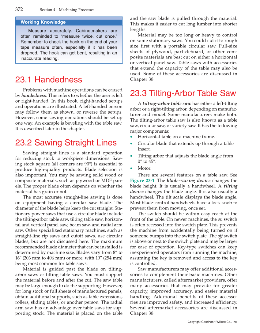 and the saw blade is pulled through the material. This makes it easier to cut long lumber into shorter lengths. Material may be too long or heavy to control on some stationary saws. You could cut it to rough size first with a portable circular saw. Full-size sheets of plywood, particleboard, or other com- posite materials are best cut on either a horizontal or vertical panel saw. Table saws with accessories that extend the capacity of the table may also be used. Some of these accessories are discussed in Chapter 38. 23.3 Tilting-Arbor Table Saw A tilting-arbor table saw has either a left-tilting arbor or a right-tilting arbor, depending on manufac- turer and model. Some manufacturers make both. The tilting-arbor table saw is also known as a table saw, circular saw, or variety saw. It has the following major components: • Horizontal table on a machine frame. • Circular blade that extends up through a table insert. • Tilting arbor that adjusts the blade angle from 0° to 45°. • Motor. There are several features on a table saw. See Figure 23-1. The blade-raising device changes the blade height. It is usually a handwheel. A tilting device changes the blade angle. It is also usually a handwheel. The tilt scale displays the blade angle. Most blade-control handwheels have a lock knob to prevent them from moving, once set. The switch should be within easy reach at the front of the table. On newer machines, the on switch is often recessed into the switch plate. This prevents the machine from accidentally being turned on if someone bumps into the switch plate. The off switch is above or next to the switch plate and may be larger for ease of operation. Key-type switches can keep inexperienced operators from running the machine, assuming the key is removed and access to the key is controlled. Saw manufacturers may offer additional acces- sories to complement their basic machines. Other manufacturers, called aftermarket providers, offer many accessories that may provide for greater capacity, improved accuracy, and easier material handling. Additional benefits of these accesso- ries are improved safety, and increased efficiency. Several aftermarket accessories are discussed in Chapter 38. Working Knowledge Measure accurately. Cabinetmakers are often reminded to “measure twice, cut once.” Remember to check the hook on the end of your tape measure often, especially if it has been dropped. The hook can get bent, resulting in an inaccurate reading. 23.1 Handedness Problems with machine operations can be caused by handedness. This refers to whether the user is left or right-handed. In this book, right-handed setups and operations are illustrated. A left-handed person may follow them as shown, or reverse the setups. However, some sawing operations should be set up one way. An example is beveling with the table saw. It is described later in the chapter. 23.2 Sawing Straight Lines Sawing straight lines is a standard operation for reducing stock to workpiece dimensions. Saw- ing stock square (all corners are 90°) is essential to produce high-quality products. Blade selection is also important. You may be sawing solid wood or composite materials, such as plywood or MDF pan- els. The proper blade often depends on whether the material has grain or not. The most accurate straight-line sawing is done on equipment having a circular saw blade. The diameter of the blade helps keep the cut straight. Sta- tionary power saws that use a circular blade include the tilting-arbor table saw, tilting table saw, horizon- tal and vertical panel saw, beam saw, and radial arm saw. Other specialized stationary machines, such as straight-line rip saws and cutoff saws, use circular blades, but are not discussed here. The maximum recommended blade diameter that can be installed is determined by machine size. Blades vary from 8″ to 16″ (203 mm to 406 mm) or more, with 10″ (254 mm) being most common for table saws. Material is guided past the blade on tilting- arbor saws or tilting table saws. You must support the material before and after the cut. The saw table may be large enough to do the supporting. However, for long stock or full sheets of manufactured panels, obtain additional supports, such as table extensions, rollers, sliding tables, or another person. The radial arm saw has an advantage over table saws for sup- porting stock. The material is placed on the table 372 Section 4 Machining Processes Copyright Goodheart-Willcox Co., Inc.