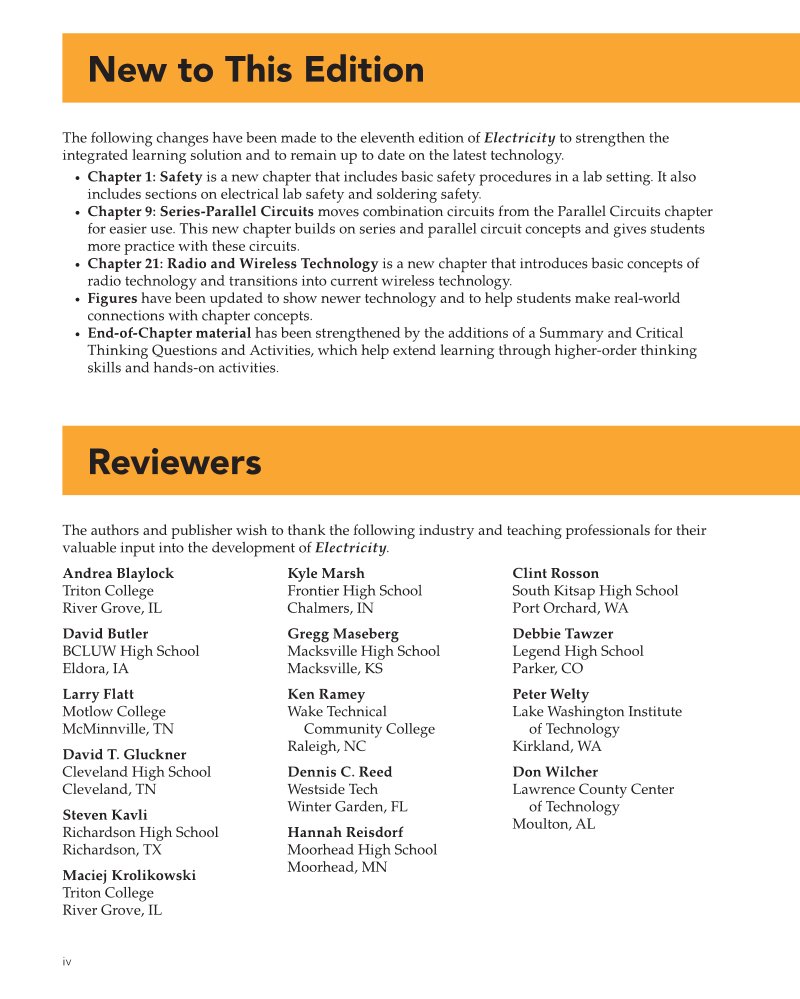 iv The following changes have been made to the eleventh edition of Electricity to strengthen the integrated learning solution and to remain up to date on the latest technology. • Chapter 1: Safety is a new chapter that includes basic safety procedures in a lab setting. It also includes sections on electrical lab safety and soldering safety. • Chapter 9: Series-Parallel Circuits moves combination circuits from the Parallel Circuits chapter for easier use. This new chapter builds on series and parallel circuit concepts and gives students more practice with these circuits. • Chapter 21: Radio and Wireless Technology is a new chapter that introduces basic concepts of radio technology and transitions into current wireless technology. • Figures have been updated to show newer technology and to help students make real-world connections with chapter concepts. • End-of-Chapter material has been strengthened by the additions of a Summary and Critical Thinking Questions and Activities, which help extend learning through higher-order thinking skills and hands-on activities. New to This Edition Reviewers The authors and publisher wish to thank the following industry and teaching professionals for their valuable input into the development of Electricity. Andrea Blaylock Triton College River Grove, IL David Butler BCLUW High School Eldora, IA Larry Flatt Motlow College McMinnville, TN David T. Gluckner Cleveland High School Cleveland, TN Steven Kavli Richardson High School Richardson, TX Maciej Krolikowski Triton College River Grove, IL Kyle Marsh Frontier High School Chalmers, IN Gregg Maseberg Macksville High School Macksville, KS Ken Ramey Wake Technical Community College Raleigh, NC Dennis C. Reed Westside Tech Winter Garden, FL Hannah Reisdorf Moorhead High School Moorhead, MN Clint Rosson South Kitsap High School Port Orchard, WA Debbie Tawzer Legend High School Parker, CO Peter Welty Lake Washington Institute of Technology Kirkland, WA Don Wilcher Lawrence County Center of Technology Moulton, AL