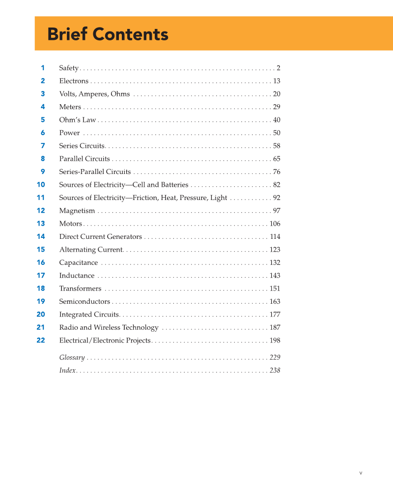 v 1 Safety. . . . . . . . . . . . . . . . . . . . . . . . . . . . . . . . . . . . . . . . . . . . . . . . . . . . . . . 2 2 Electrons . . . . . . . . . . . . . . . . . . . . . . . . . . . . . . . . . . . . . . . . . . . . . . . . . . . 13 3 Volts, Amperes, Ohms . . . . . . . . . . . . . . . . . . . . . . . . . . . . . . . . . . . . . . . 20 4 Meters . . . . . . . . . . . . . . . . . . . . . . . . . . . . . . . . . . . . . . . . . . . . . . . . . . . . . 29 5 Ohm’s Law . . . . . . . . . . . . . . . . . . . . . . . . . . . . . . . . . . . . . . . . . . . . . . . . . 40 6 Power . . . . . . . . . . . . . . . . . . . . . . . . . . . . . . . . . . . . . . . . . . . . . . . . . . . . . 50 7 Series Circuits. . . . . . . . . . . . . . . . . . . . . . . . . . . . . . . . . . . . . . . . . . . . . . . 58 8 Parallel Circuits . . . . . . . . . . . . . . . . . . . . . . . . . . . . . . . . . . . . . . . . . . . . . 65 9 Series-Parallel Circuits . . . . . . . . . . . . . . . . . . . . . . . . . . . . . . . . . . . . . . . 76 10 Sources of Electricity—Cell and Batteries . . . . . . . . . . . . . . . . . . . . . . . 82 11 Sources of Electricity—Friction, Heat, Pressure, Light . . . . . . . . . . . . 92 12 Magnetism . . . . . . . . . . . . . . . . . . . . . . . . . . . . . . . . . . . . . . . . . . . . . . . . . 97 13 Motors. . . . . . . . . . . . . . . . . . . . . . . . . . . . . . . . . . . . . . . . . . . . . . . . . . . . 106 14 Direct Current Generators . . . . . . . . . . . . . . . . . . . . . . . . . . . . . . . . . . . 114 15 Alternating Current. . . . . . . . . . . . . . . . . . . . . . . . . . . . . . . . . . . . . . . . . 123 16 Capacitance . . . . . . . . . . . . . . . . . . . . . . . . . . . . . . . . . . . . . . . . . . . . . . . 132 17 Inductance . . . . . . . . . . . . . . . . . . . . . . . . . . . . . . . . . . . . . . . . . . . . . . . . 143 18 Transformers . . . . . . . . . . . . . . . . . . . . . . . . . . . . . . . . . . . . . . . . . . . . . . 151 19 Semiconductors . . . . . . . . . . . . . . . . . . . . . . . . . . . . . . . . . . . . . . . . . . . . 163 20 Integrated Circuits. . . . . . . . . . . . . . . . . . . . . . . . . . . . . . . . . . . . . . . . . . 177 21 Radio and Wireless Technology . . . . . . . . . . . . . . . . . . . . . . . . . . . . . . 187 22 Electrical/Electronic Projects. . . . . . . . . . . . . . . . . . . . . . . . . . . . . . . . . 198 Glossary . . . . . . . . . . . . . . . . . . . . . . . . . . . . . . . . . . . . . . . . . . . . . . . . . . . 229 Index. . . . . . . . . . . . . . . . . . . . . . . . . . . . . . . . . . . . . . . . . . . . . . . . . . . . . . 238 Brief Contents
