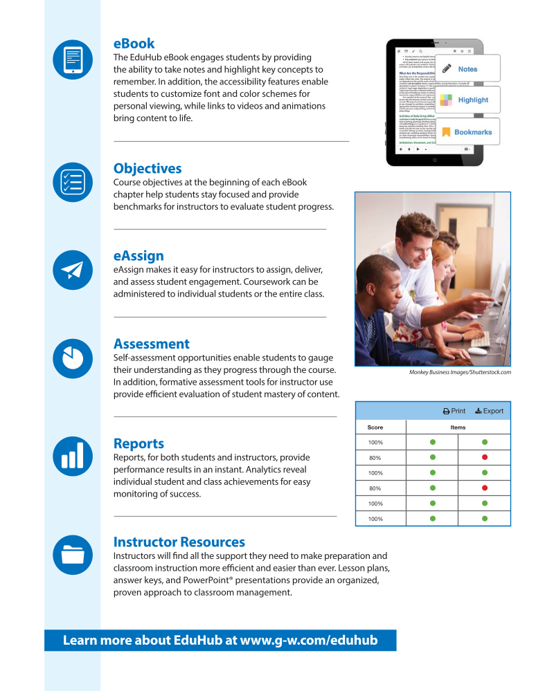 eBook The EduHub eBook engages students by providing the ability to take notes and highlight key concepts to remember. In addition, the accessibility features enable students to customize font and color schemes for personal viewing, while links to videos and animations bring content to life. Objectives Course objectives at the beginning of each eBook chapter help students stay focused and provide benchmarks for instructors to evaluate student progress. eAssign eAssign makes it easy for instructors to assign, deliver, and assess student engagement. Coursework can be administered to individual students or the entire class. Assessment Self-assessment opportunities enable students to gauge their understanding as they progress through the course. In addition, formative assessment tools for instructor use provide effi cient evaluation of student mastery of content. Monkey Business Images/Shutterstock.com Reports Reports, for both students and instructors, provide performance results in an instant. Analytics reveal individual student and class achievements for easy monitoring of success. Instructor Resources Instructors will fi nd all the support they need to make preparation and classroom instruction more effi cient and easier than ever. Lesson plans, answer keys, and PowerPoint® presentations provide an organized, proven approach to classroom management. Learn more about EduHub at www.g-w.com/eduhub Score 100% Print Export 80% 80% 100% 100% 100% Items